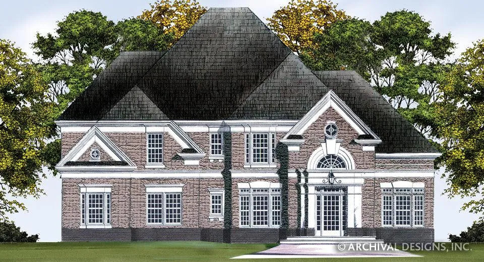 The Eastcote Place house plan is a two-story, traditional elegant home. An imposing yet graceful hip roof line tops a myriad of window panes in this stately design. Fanlight and ox eye windows over a casement door light the two-story foyer that leads to the U-shaped staircase. Columns decorate the formal dining hall. The kitchen leads to a butler's pantry and includes a corner sink and a bar. The morning room adjoins the two-story grand salon through an elegant archway, which dramatizes the height of that room's ceiling. A full bath serves a guest room that has double doors and windows to the front. The master suite upstairs features double doors, an octagonal tray ceiling and closets in both the bedroom and the bath. The bath also offers a corner tub, shower seat and twin vanities. Two additional bedrooms on this floor share a full bath that includes private vanities.
