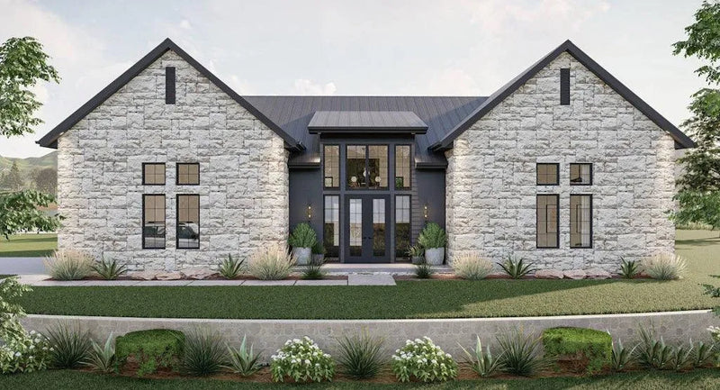The Edenton barndominium style house plan is a bold barndo home with 1734 square feet, 3 bedrooms, and 2 bathrooms. The exterior of this home is beautifully unique with stone and dark accents.
