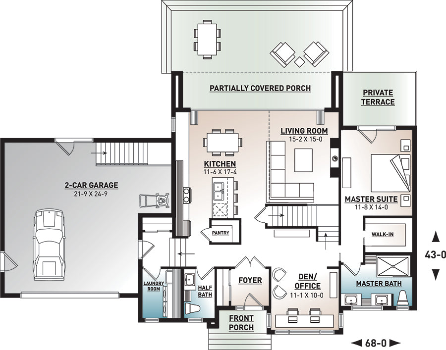 This versatile two-story house plan offers a total living space of 2,142 sq ft, with 1,446 sq ft on the first floor and 696 sq ft on the second floor. Its 68’ width and 43’ depth create a functional layout, ideal for family living. The design includes 4 bedrooms, 2 bathrooms, and 1 half bathroom, all framed with durable 2x6 walls and supported by a truss roof system.
