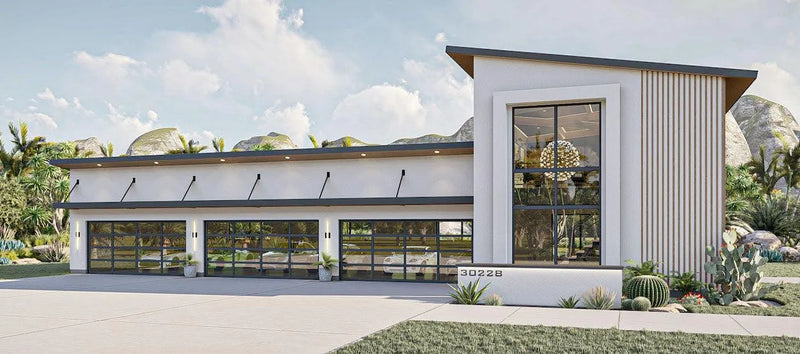 This expansive garage plan features a total living area of 835 sq. ft., with the majority of the space allocated to a well-designed second floor loft that provides additional utility. The first floor spans 40 sq. ft. for a workshop and storage space. Also on the same floor found a dedicated spacious garage space, offering a generous 2,946 sq. ft. designed to accommodate up to seven vehicles. With a front-loading garage, access is both convenient and efficient.
