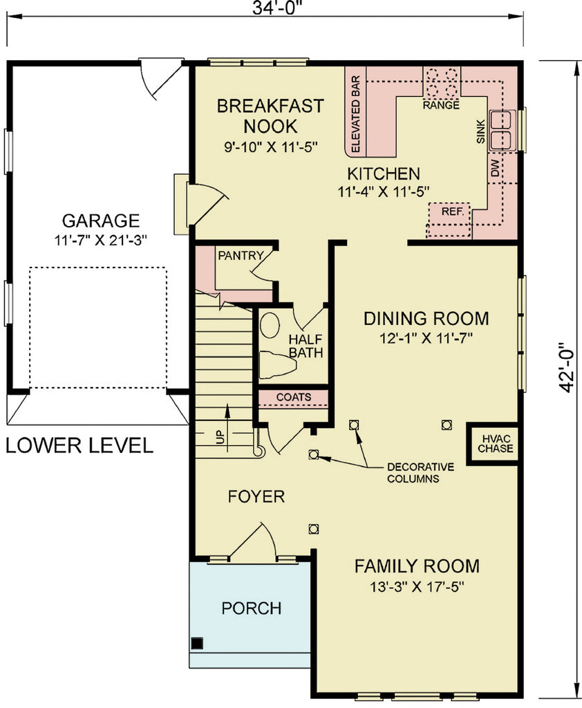 Built for efficiency, this home includes a 264 sq ft front-load garage and a bonus 188 sq ft unfinished recreation room on the second floor—ideal for a future playroom, home gym, or office. With a 12:12 roof pitch, stick framing, and durable siding exterior, the design blends traditional charm with modern construction. The 48 sq ft front porch adds character and welcomes guests with warmth. Measuring 34' wide by 42' deep, this home is a perfect fit for narrow lots without compromising space or style. It’s an excellent choice for families, first-time buyers, or anyone looking for an efficient layout with premium touches.