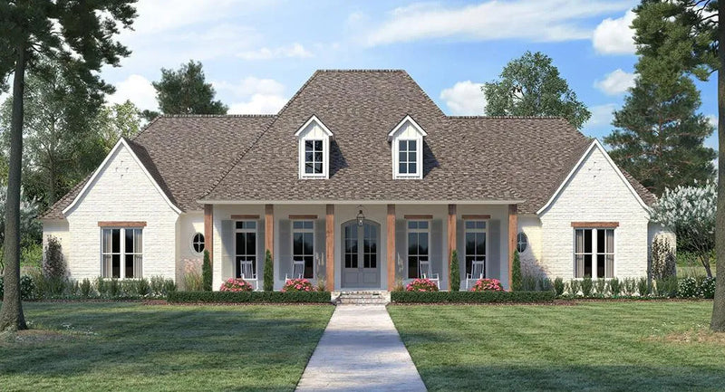 Striking beams accent an elegant covered front porch of this dignified Grand Prairie Country house plan. This one-story plan borrows from European & French, Craftsman and Ranch flair and style whilst offering a unique home with copious curb appeal. With four bedrooms, three bathrooms plus one half bathroom, an impressive 3273. sq. ft of space is available to create the home of your dreams.