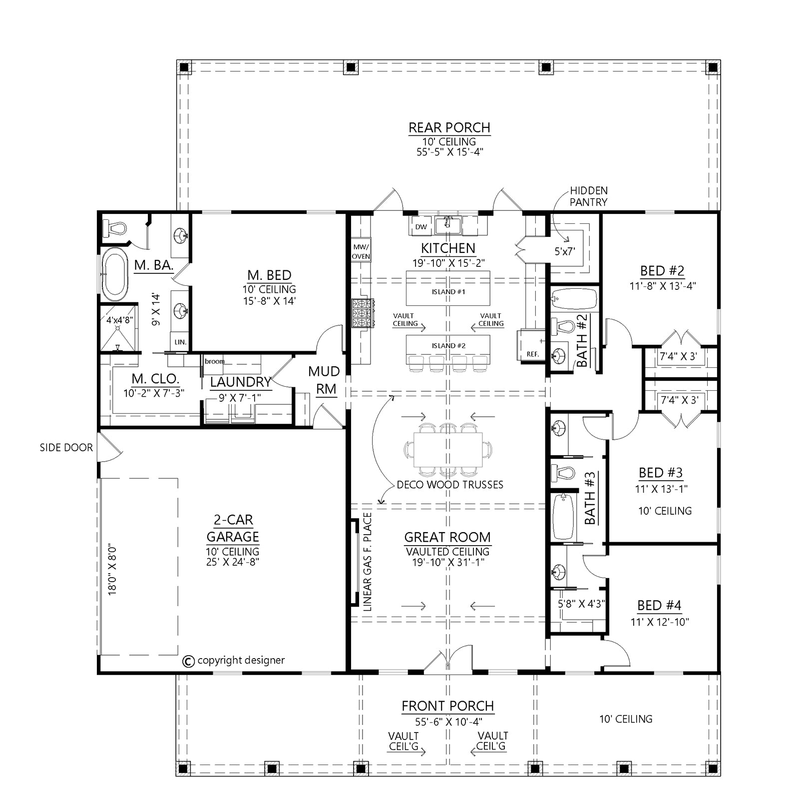 The first-floor master suite is a luxurious retreat with a spa-like bath, walk-in closet, and direct access to the laundry room for added convenience. Additional thoughtful features include a split-bedroom layout, mud room, and first-floor laundry. Outdoor living shines with 1,424 sq. ft. of porch space, including covered front and back porches that invite you to relax and unwind. With a side-load 2-car garage, 10-foot ceilings, and a blend of 6:12 and 8:12 roof pitches, this home blends comfort, charm, and timeless design.