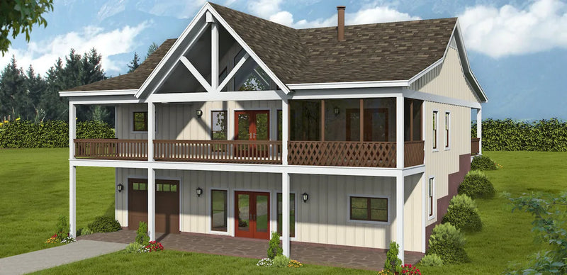 • This 2 bed house plan has 10'-deep porches running across both the front and back of the home. Designed for a sloping lot, the ground level is covered by the porch above and there is a 1-car drive-under garage as well.