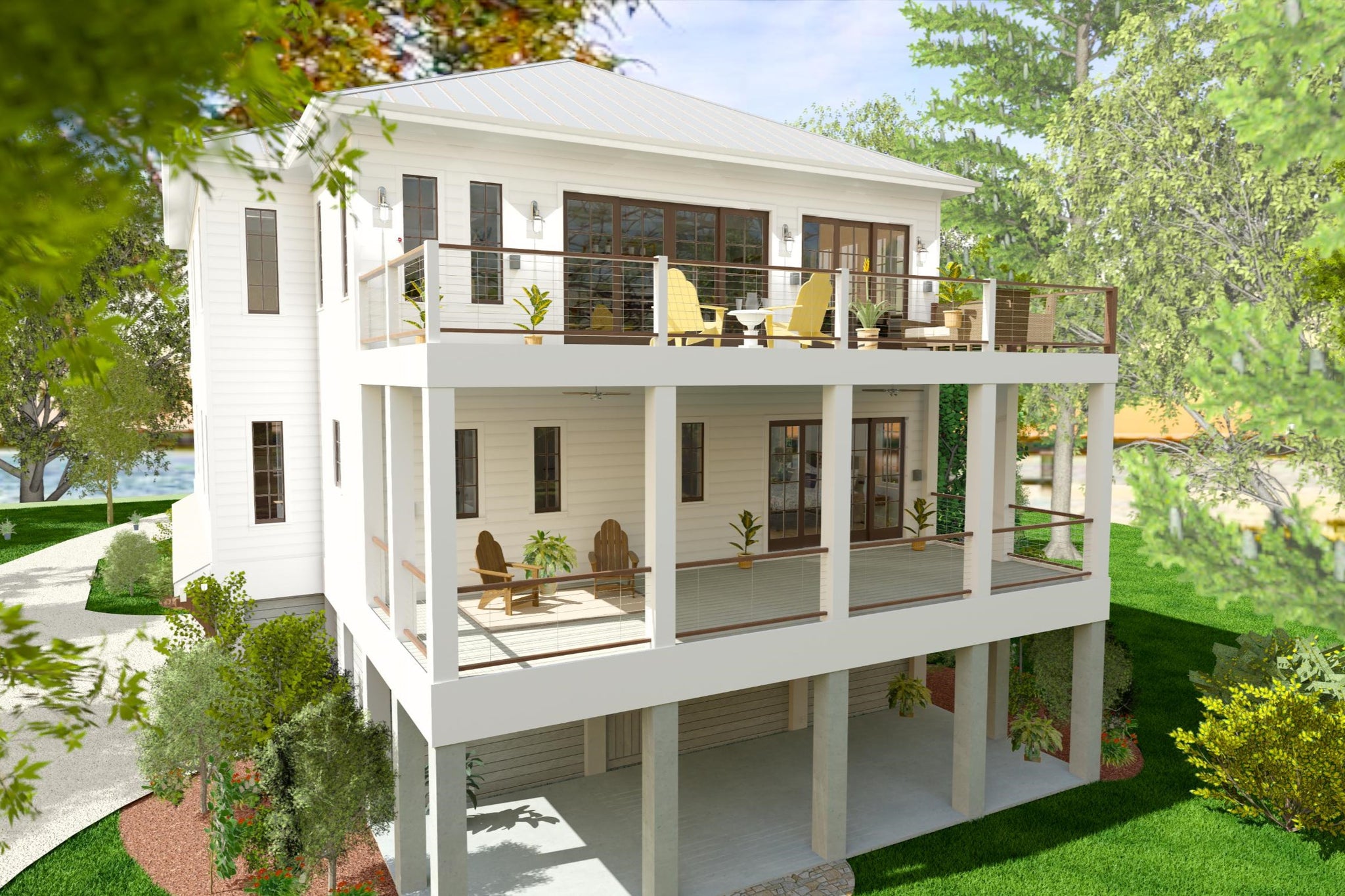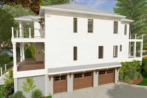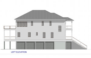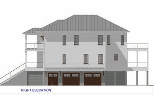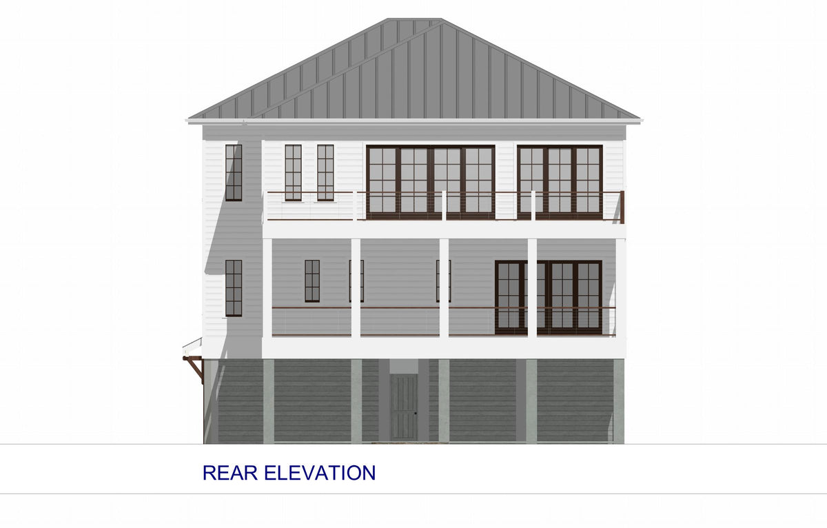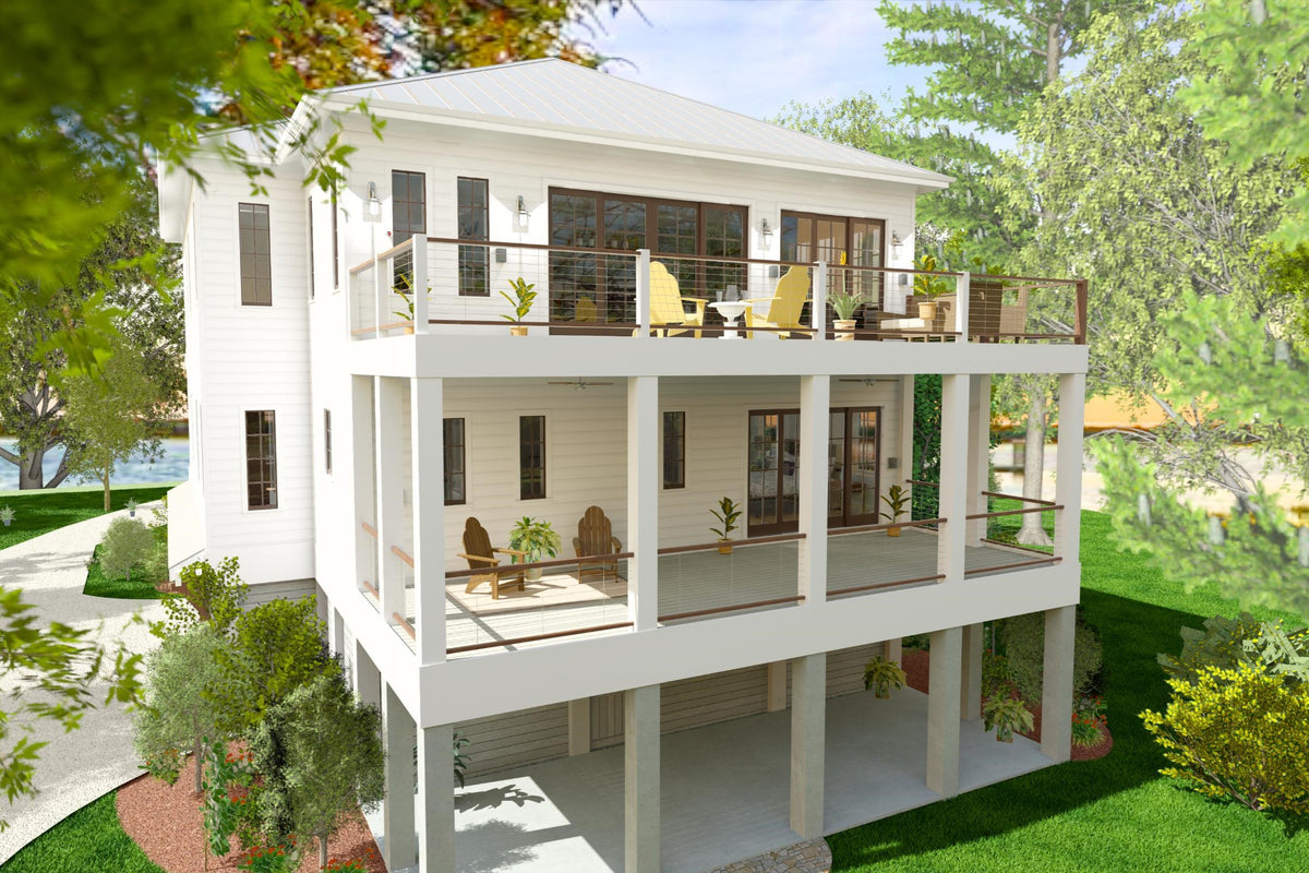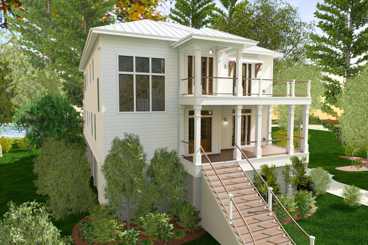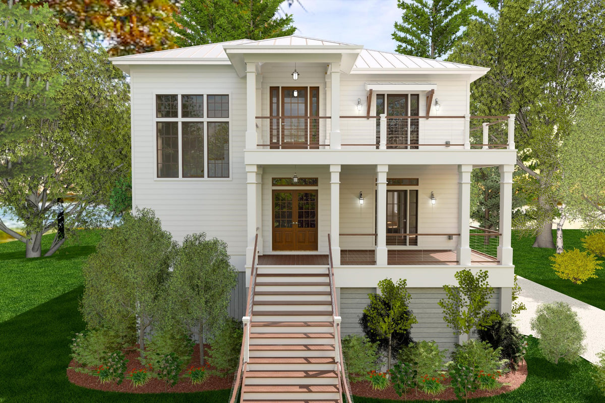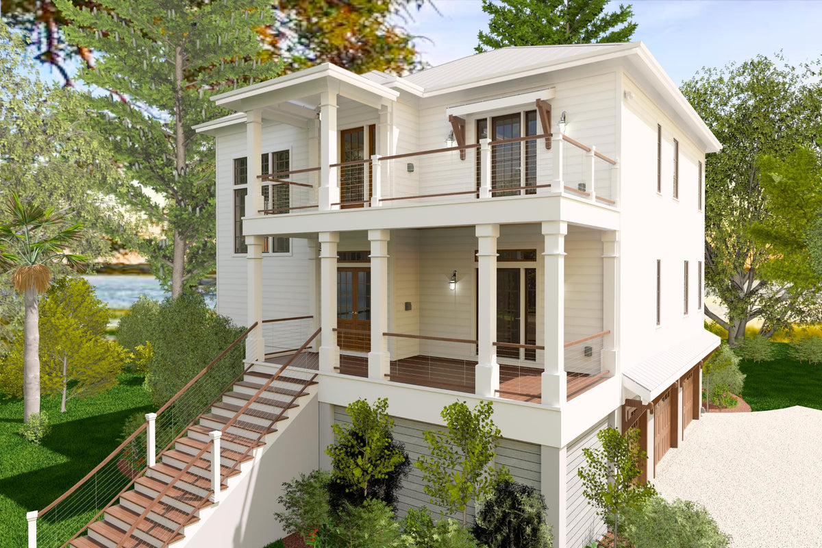This Low Country-style home offers a well-designed reverse living layout, where all bedrooms are on the main level, while the living spaces are elevated to the second floor for enhanced views and privacy. The first floor features a spacious master suite with a double vanity bathroom and walk-in closet, along with three additional bedrooms, including a Jack and Jill bathroom setup. A first-floor laundry room adds convenience, and an elevator provides seamless access to the second floor. The pier foundation elevates the home, creating a grand entry with a covered front porch, while a rear covered porch offers additional outdoor space.