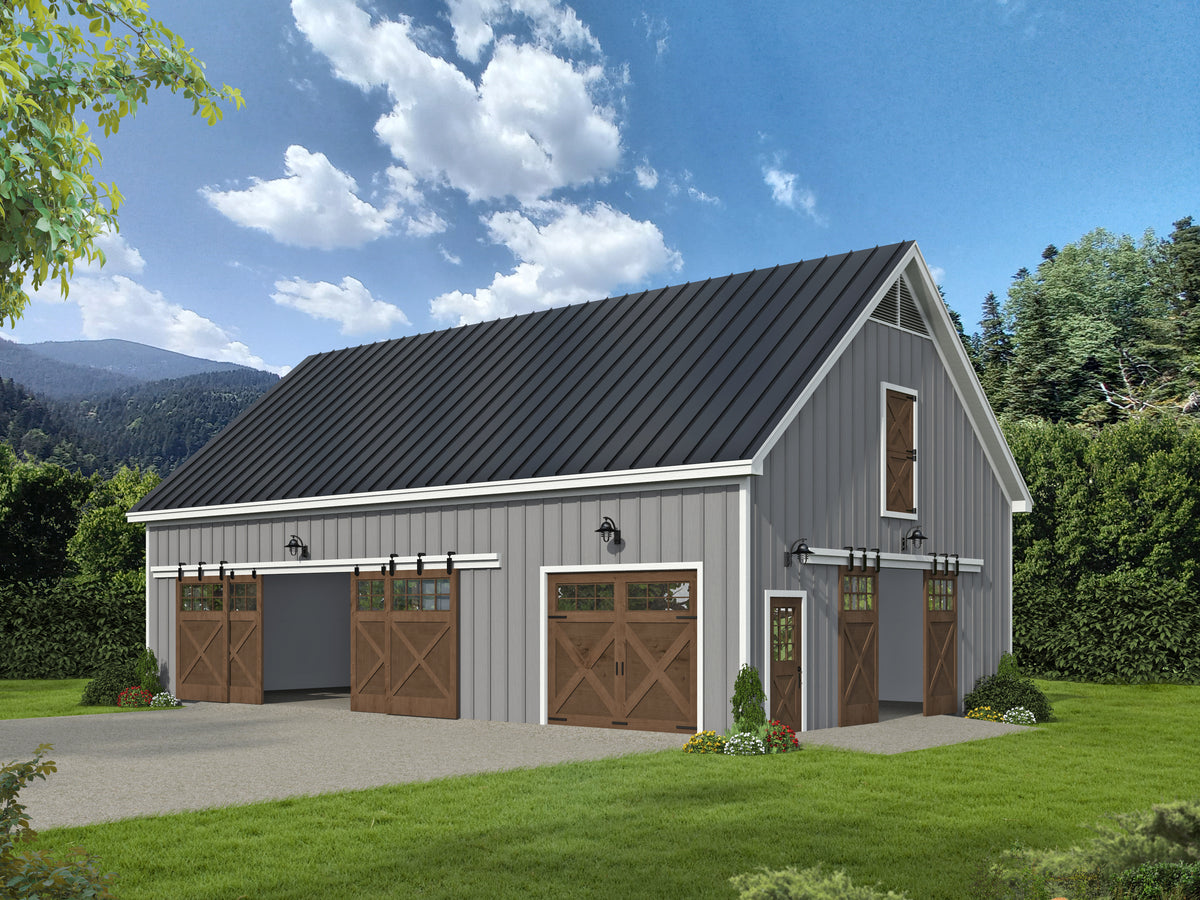 This stunning garage barn house combines rugged charm with flexible living and storage space. The 1,530 sq ft main floor offers room for up to four vehicles, a workshop, or even a small business setup — all framed in rustic barn-style architecture with soaring 10-foot ceilings and wide-open utility.