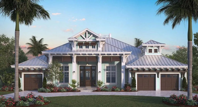 The Harbor House plan features all of the essential Caribbean elements like a large covered entry, shutters, and decorative gable and overhang brackets. A metal roof and cupola complete its beautiful exterior. Inside, the foyer is flanked by a dining room and study but gives way to a large great room and island kitchen. The great room features a large set of stacking glass sliders so that it can be combined almost seamlessly with the uniqueoutdoor living spaces. The dinette, with wet bar, also brings the outdoors and pool area in through large floor-to-ceiling windows on two sides.