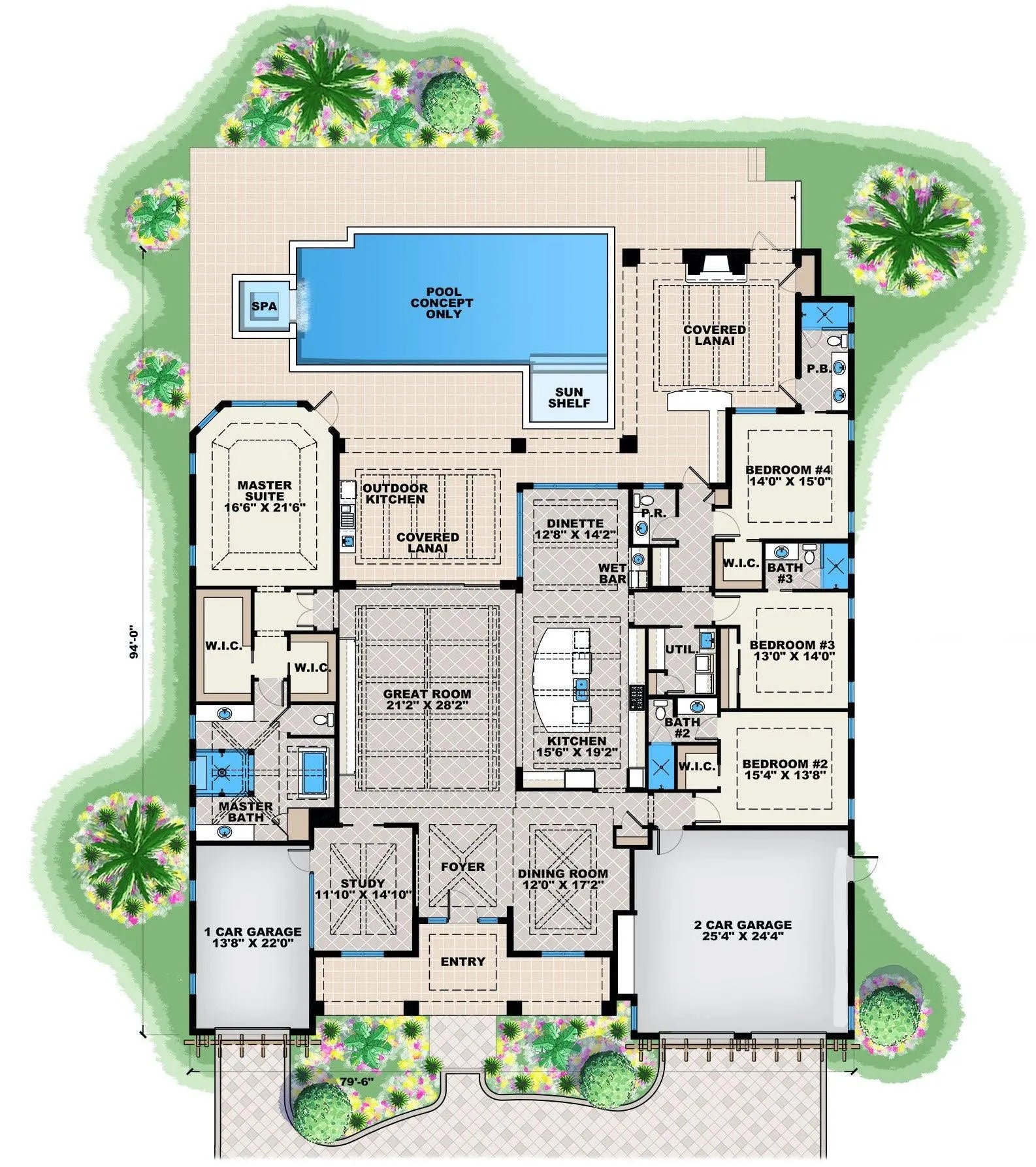 The massive covered lanai includes two distinct sitting areas, an outdoor kitchen, and access to the powder bath. The luxurious master suite of the home plan features two walk-in closets and an opulent bath. The home has three additional bedrooms, two full baths, two powder rooms and split garages,a one-car and a two-car, both with access to the interior.
