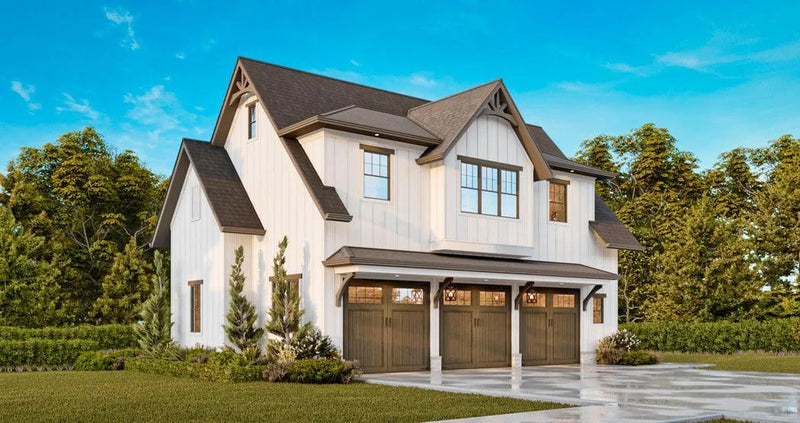 Hazel Garage Plan is a stunning modern farmhouse-style garage with a charming and timeless design. The exterior showcases classic board-and-batten siding in a crisp white color, contrasted beautifully by dark accents, including the window frames and trim. The roof is a steeply pitched gable style, adding to the home's traditional farmhouse appeal, while the decorative trusses above the garage provide a rustic touch.