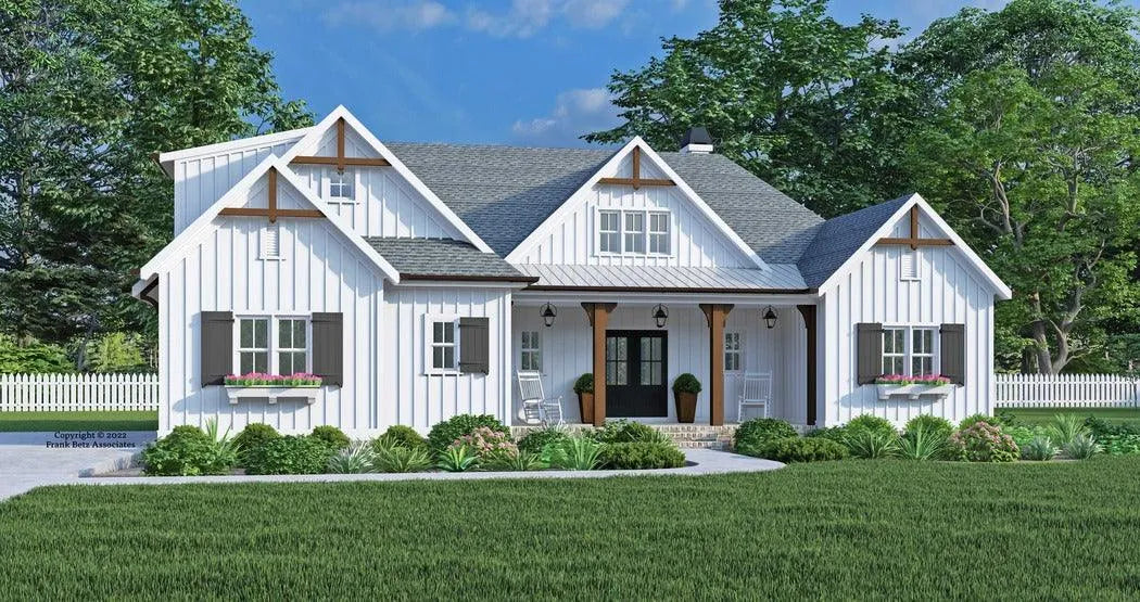 A fantastic example of the modern farmhouse style in every sense is the Helmsly Park. Desirable one story living combined with farmhouse details is sure to satisfy discerning buyers. A clean, bright palate of white cladding and dark trim accents define the farmhouse movement. An inviting front porch welcomes all for a chat or visit. The interior continues to provide a bright feeling and a casual life style. The living room is tall; with a beamed ceiling and a warming fireplace. The kitchen and dining area are adjacent for gatherings and inclusion. The bedrooms are split by the living spaces and provide privacy and restfulness when needed most. A large pantry and mudroom help with organization and storage for every day needs. An additional bedroom and bath are located upstairs to complete this ranch style farmhouse. There is an optional bonus room as well to finish and utilize as need be.