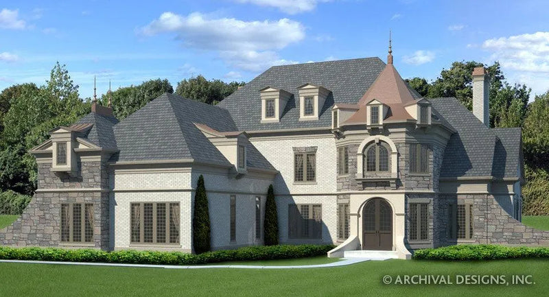 The Hennessey House is a Grand Home that captures anyone's attention with its tasteful use of brick and stone on an impressive exterior. The Hennessey House Plan poignantly offers a Castle like Grand Tower adorned by ornate windows, and a copper Steeple. The expansive Wing Walls add to the French & European feel.