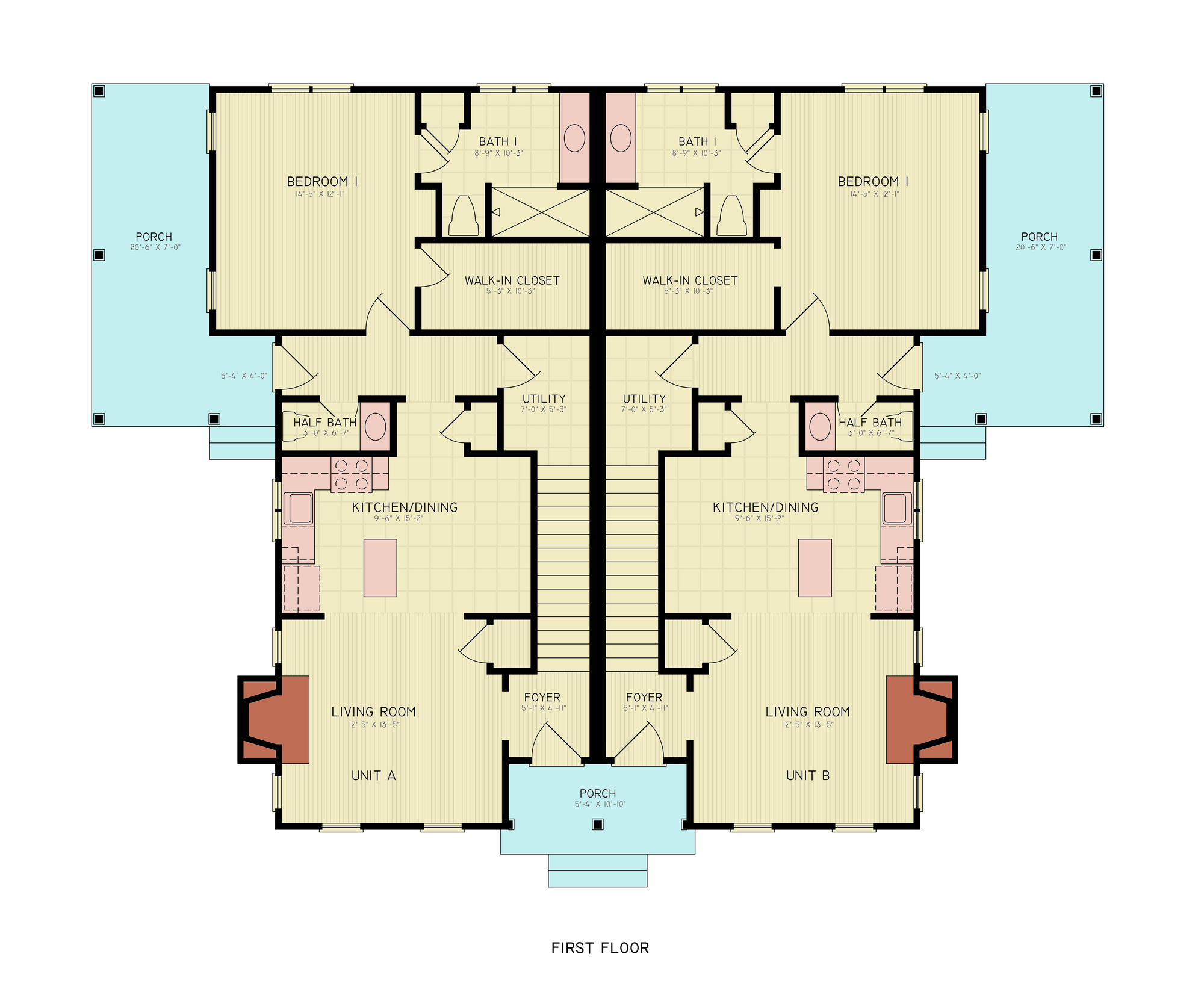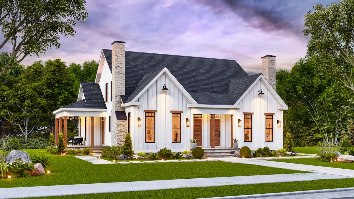 The exterior showcases charming architectural details, including a covered front porch and an inviting side porch, ideal for outdoor relaxation and socializing. The house features a 9:12 roof pitch with stick roof framing and durable 2x4 wall framing. Both units benefit from walk-in closets, providing ample storage and organization. A cozy fireplace adds a touch of warmth and elegance to the living areas. Set on a crawl space foundation, this duplex design combines practicality, comfort, and modern amenities, making it an excellent choice for families or investors looking for a versatile multifamily living solution.