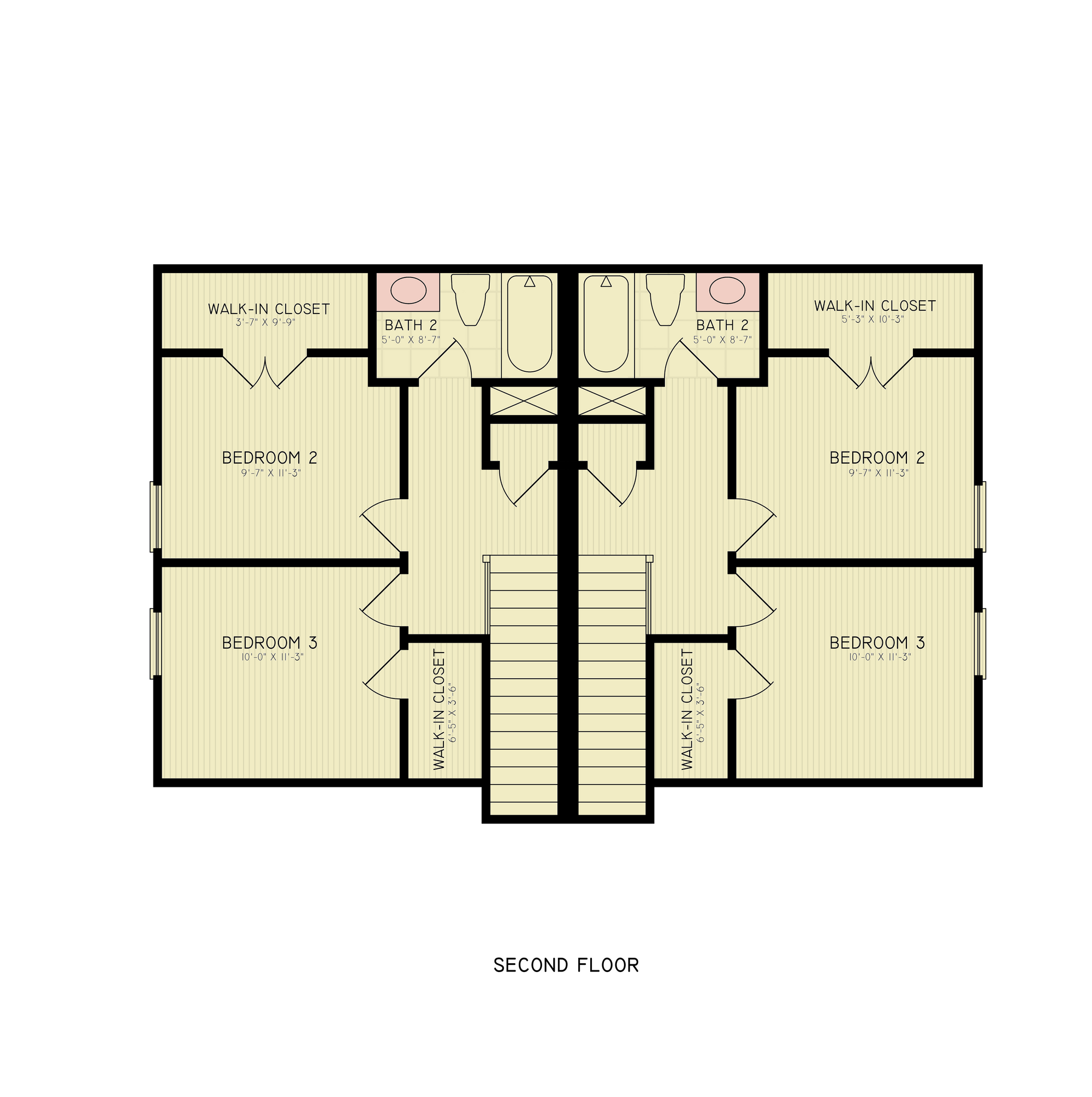 This spacious multifamily duplex house plan offers a total of 2757 sq ft of heated living space, thoughtfully divided between two units. The first floor provides 1871 sq ft, while the second floor adds another 885 sq ft, ensuring ample room for comfortable living. Each unit features 3 bedrooms and 2 bathrooms, along with an additional half bathroom for convenience. The open-concept layout includes a modern kitchen with an island, a walk-in pantry, and generous storage space, perfect for families or tenants seeking functionality and style. The first floor boasts a 9' ceiling height, enhancing the sense of space, while the second floor maintains a cozy 8' ceiling.
