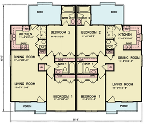 Designed with a welcoming aesthetic, the exterior features a 108 sq ft covered front porch and a combined 238 sq ft of rear deck space, great for relaxing or entertaining. With a modest building height of 15'10", an efficient 6:12 roof pitch, and traditional 2x4 stick framing, this multi-family home blends practicality with charm. At 56'3" wide and 45'6" deep, it offers a balanced footprint that works well on a variety of lot sizes, making it an ideal choice for homeowners or investors seeking comfortable duplex living.