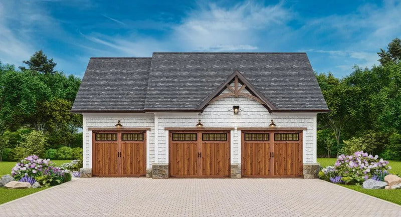 The first floor boasts an expansive 964 sq. ft. garage with three front-load bays and a 10-foot ceiling, perfect for vehicle storage, workshop space, or additional storage needs. This plan is an excellent choice for those seeking an efficient, stylish living space combined with ample room for vehicles and hobbies, all within a functional detached structure.
