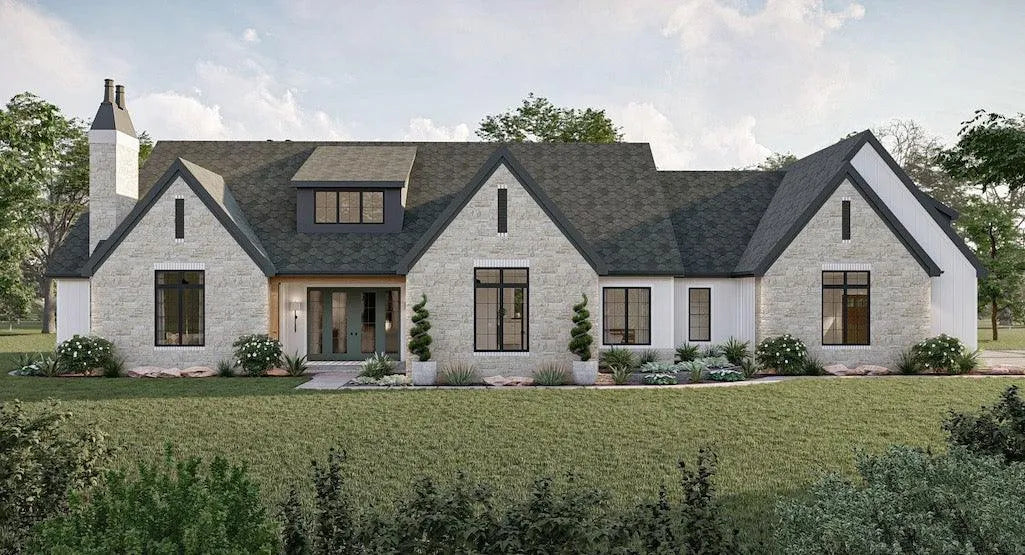 The Hither Hills is a beautiful 3 Car Modern European Cottage style house plan. The steep pitches, short gable overhangs, and wood accents give this home amazing curb appeal.