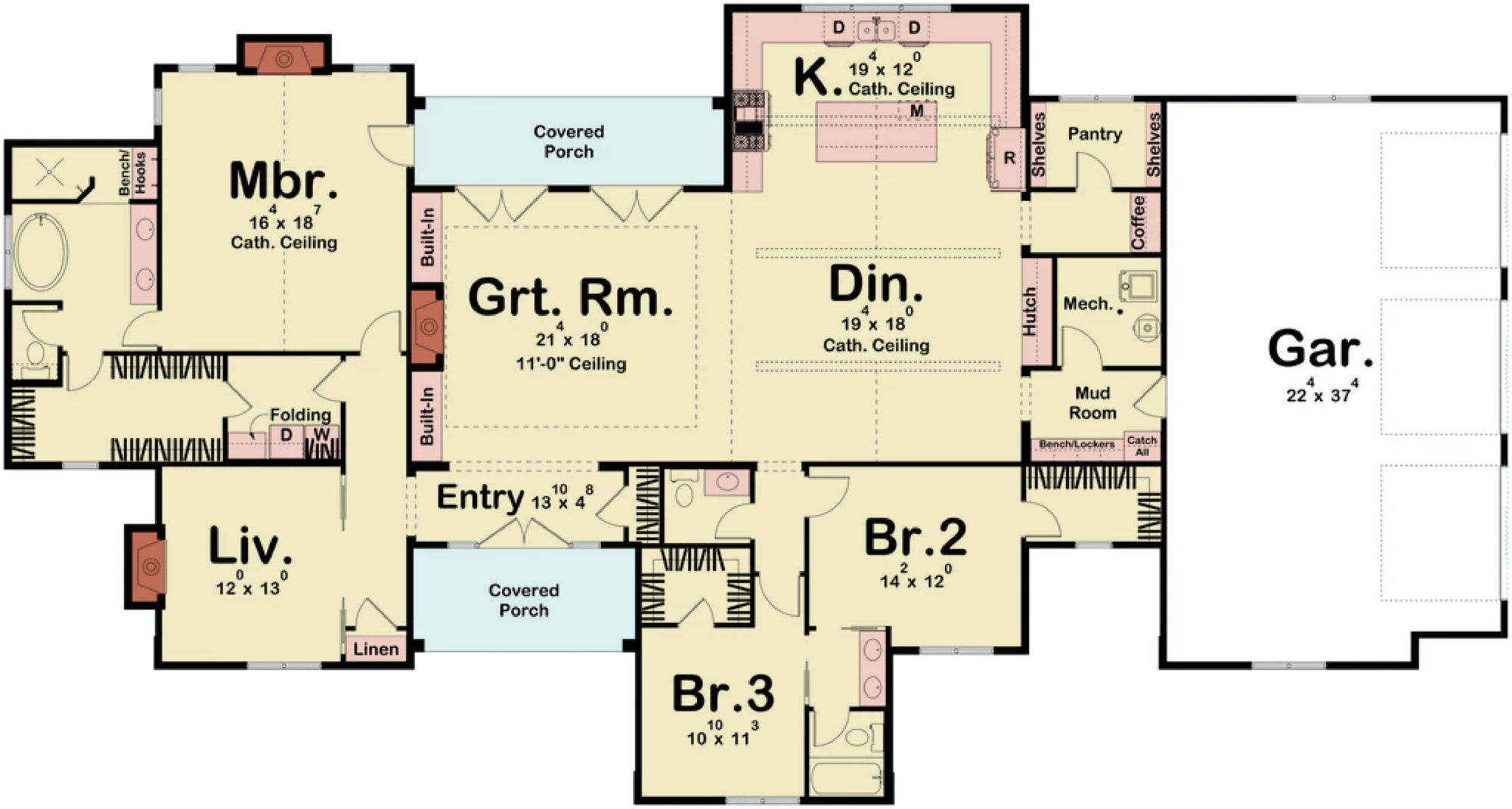 This house has 3 bedrooms. The secondary bedrooms share a jack-and-jill bath while the master bedroom has its own. The master bedroom is covered by a soaring cathedral ceiling and has a built-in fireplace. The master walk-in closet connects to both the bathroom and the laundry room. A separate living room near the entry could be used as an office or any flex space.