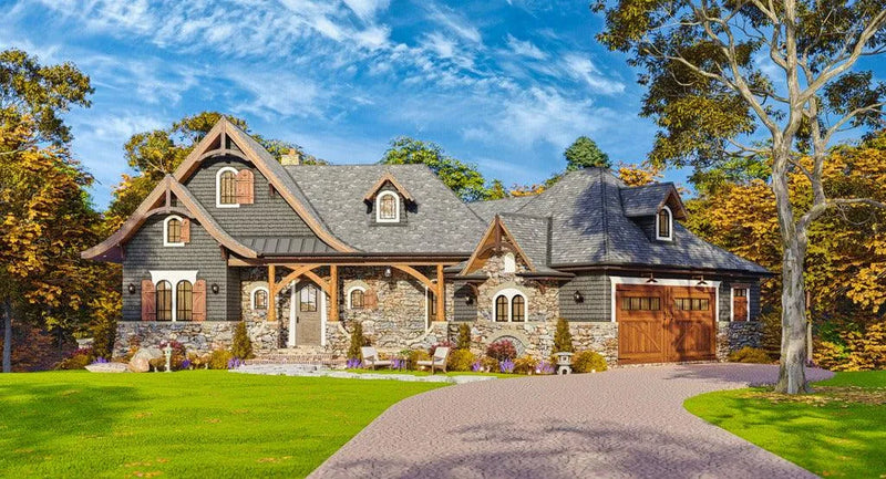 Natural materials including stone and wood accents are the focal point on this cozy rustic house plan. The front covered porch invites you into this mountain home design featuring open spaces, timber trusses, and spectacular outdoor views. The large kitchen opens into the casual dining area and vaulted lodge room. The kitchen includes an abundant amount of counter space perfect for entertaining family and friends. The lodge room features a fireplace with built-in shelves and open onto the vaulted covered porch. The master bedroom features a coffered ceiling and includes a master bath with double vanity, walk-in closet, and additional rear covered porch. Rounding out this first floor plan are two additional bedrooms with their own bathrooms. The optional second floor plan includes a loft area and storage space.