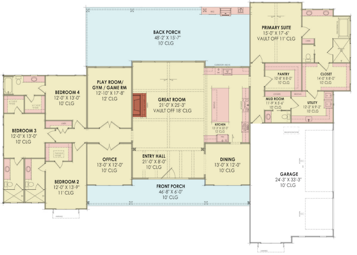 • Three bedroom suites consume the left side of the layout, along with a game room that overlooks the 15'7"-deep rear porch.