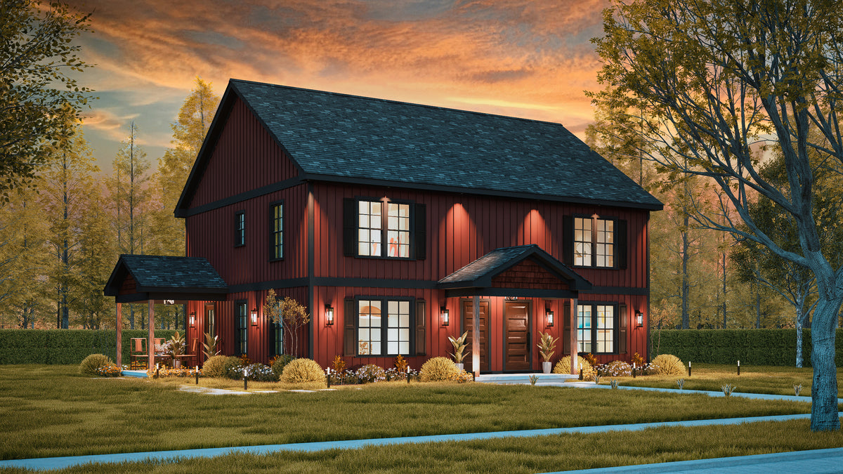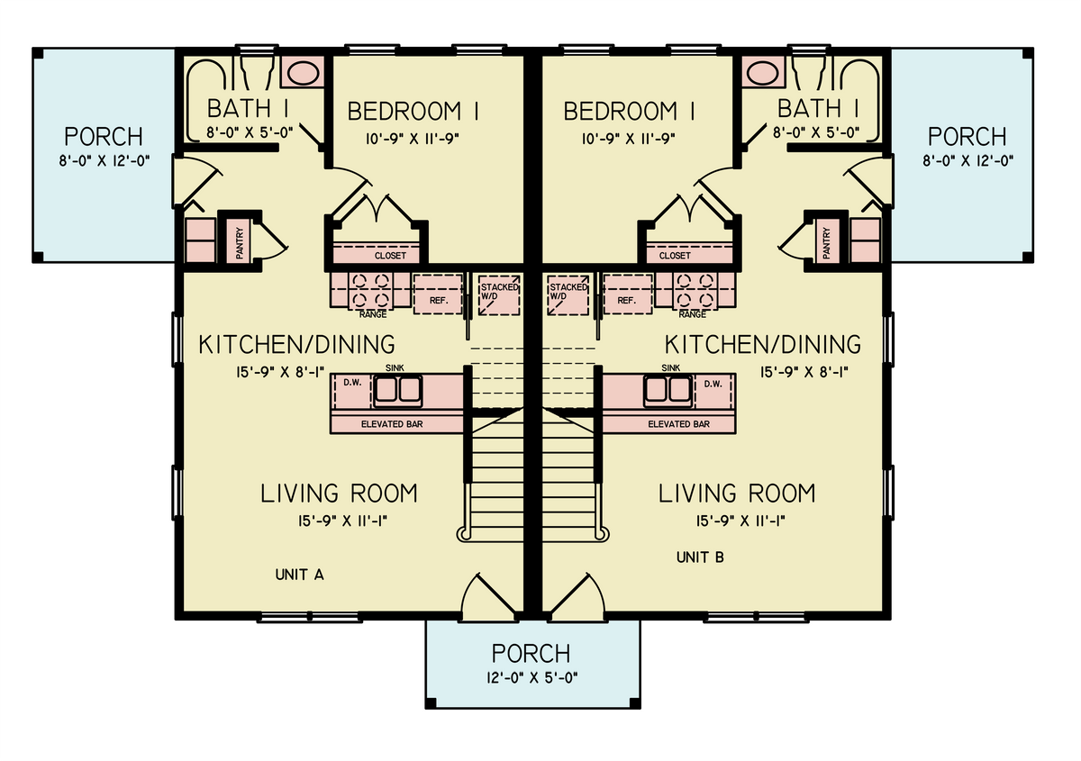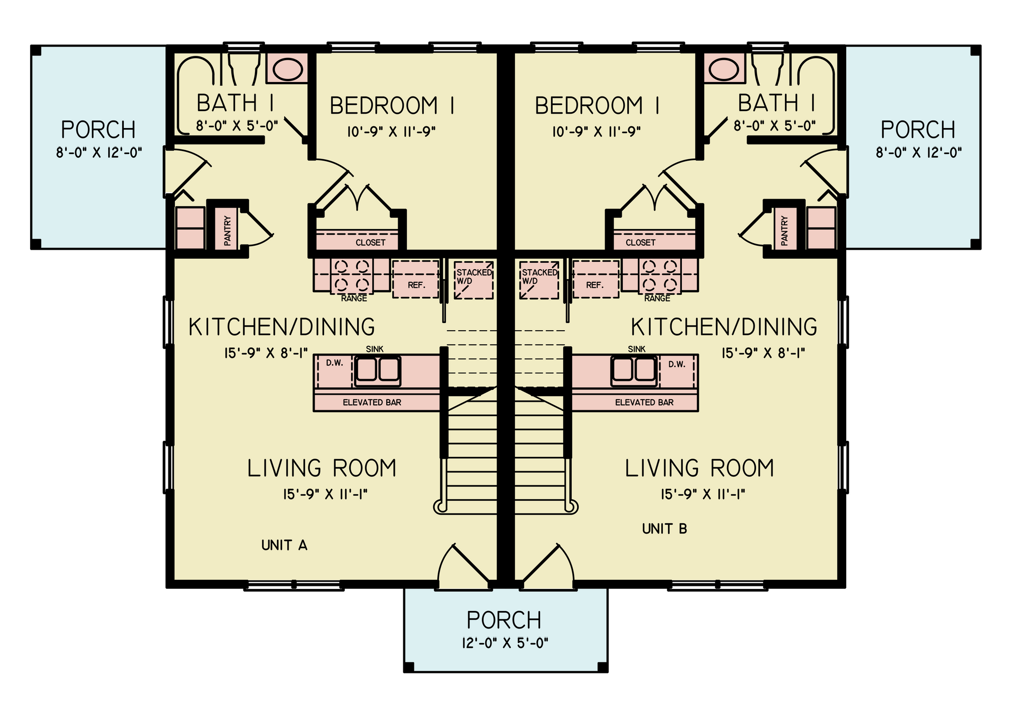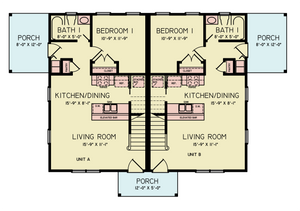 Each unit includes a covered front porch and a private side porch (96 sq. ft.), ensuring separate outdoor spaces for relaxation. The side porches are positioned on opposite sides of the duplex, maintaining privacy for both occupants. Built on a slab foundation, the home features stick-framed roofing with an 8:12 pitch and 8-foot ceilings on both floors, giving it an open and airy feel. The structure measures 56 feet wide by 37 feet deep, maximizing space efficiency without compromising comfort.