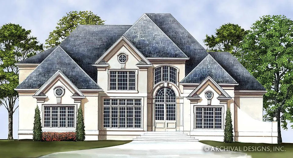 European extravagance, dazzled with chateau style, makes this enormous manor home the epitome of luxury and charm. A dramatic display of windows and a glorious arched entrance beautify the exterior. Stately steps lead up the front porch to double doors, which open inside to the spacious two-story foyer. A dramatic staircase cascades into foyer, which is flanked on either side by the formal dining room and parlor. The dining room is defined by its outlying columns. Straight ahead, the lofty two-story living room is illuminated by a wall of windows at the rear. An enormous hearth warms the entire room and is flanked by built-in shelves. The cozy breakfast area is open to both the casual bayed breakfast room and the gourmet kitchen. The three-car garage is located nearby. The left wing of the main floor is almost entirely devoted to the master suite, which provides a large master bath with a whirlpool tub and a huge walk-in closet. Upstairs, all of the family bedrooms feature their own closet and shared baths.