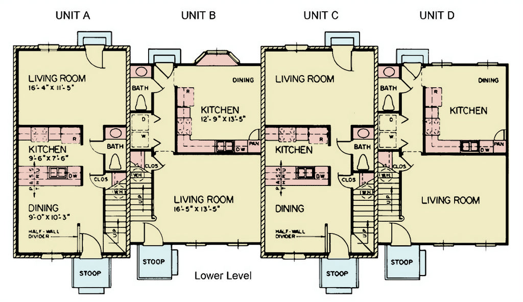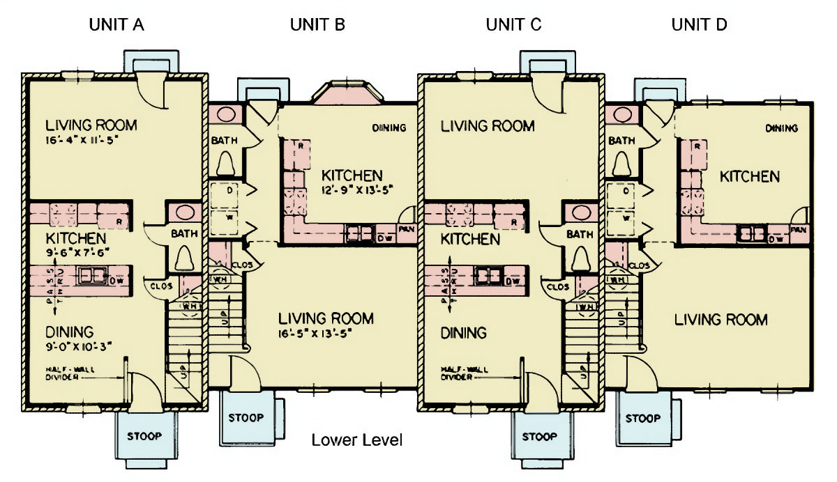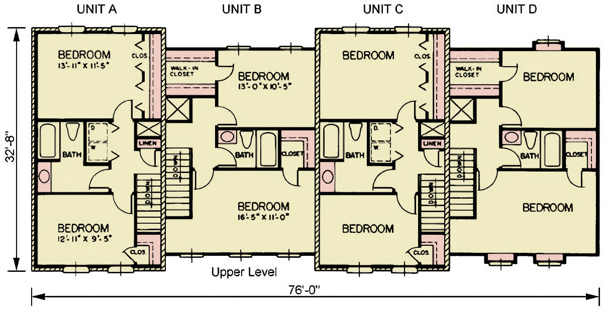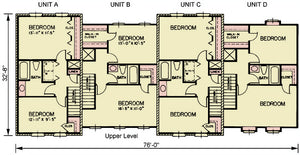 The architecture subtly distinguishes the exterior with brick finishes on Units A and C, and siding on Units B and D, adding visual appeal to the cohesive design. With a total of 8 bedrooms and 8 bathrooms, this property is a prime opportunity for multi-family rental income or urban housing development.