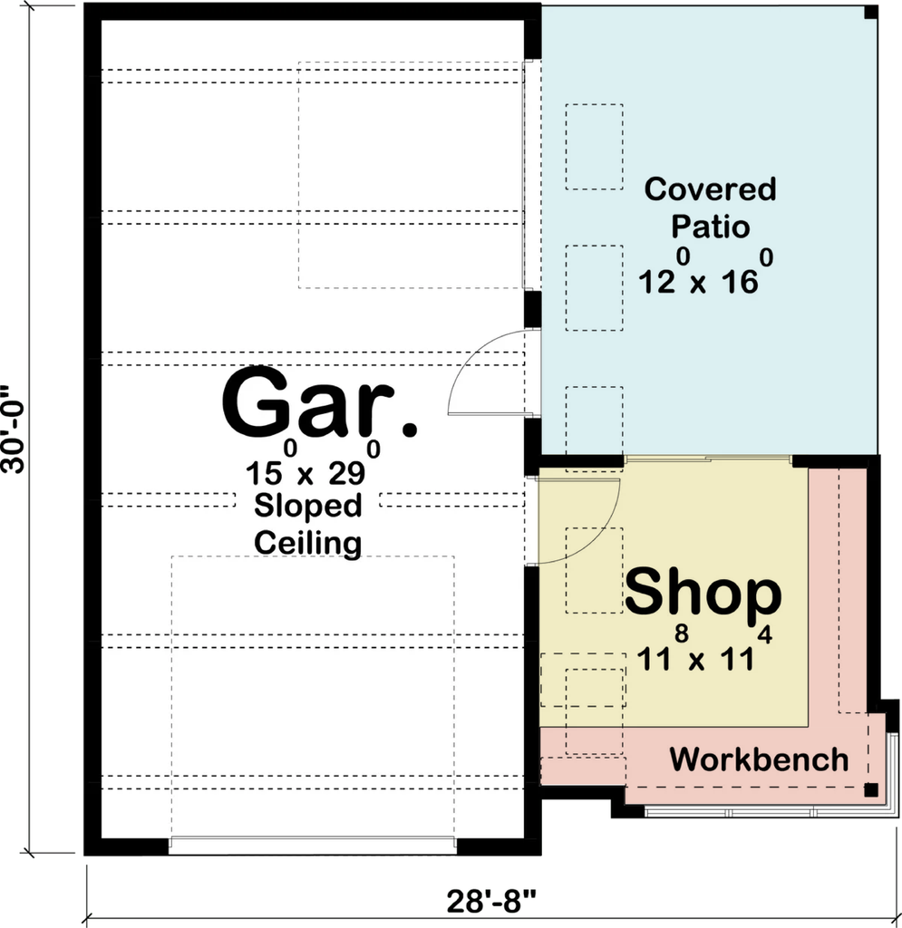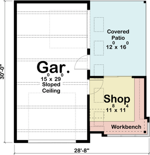 This plan is designed to be functional and beautiful - a garage one could spend all day in! The garage ceiling slopes with the roof, with a bank of clerestory windows to bring in lots of light. There is a secondary garage door to really open up the space to let in some fresh air, to work outside when you just need some extra space, or even to relax or throw a party under the covered patio.