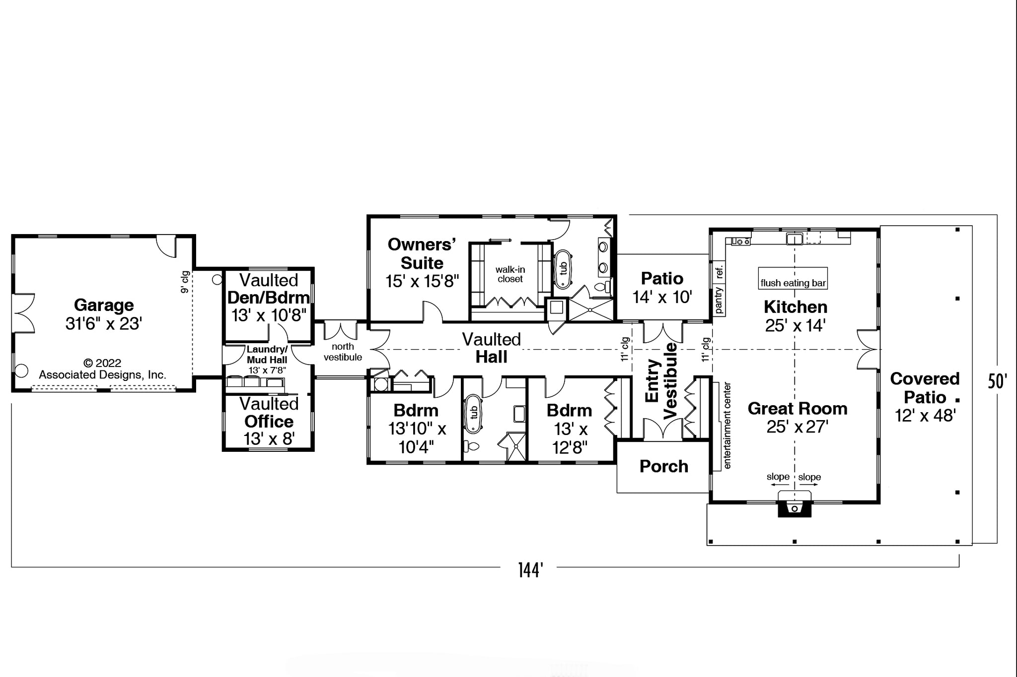 This split-bedroom layout offers privacy and flexibility. The private master suite features a luxurious bath and generous walk-in closet, while three additional bedrooms are located on the opposite side of the home. Bonus spaces like a home office/study, den, mudroom, and first-floor laundry add convenience and versatility. Outside, enjoy a covered patio, board and batten siding, and a front-load 2-car garage (740 sq ft) that blends seamlessly with the home’s wide 144-foot footprint. Ideal for families or those wanting spacious, single-level living with style and function.