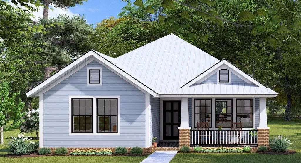 This delightful house plan offers a total living area of 1,271 square feet, all situated on the first floor. Complemented by a 136-square-foot front porch and a cozy 28-square-foot rear porch, this design provides welcoming outdoor spaces for relaxation. The home features three bedrooms and two bathrooms, making it perfect for families or guests.