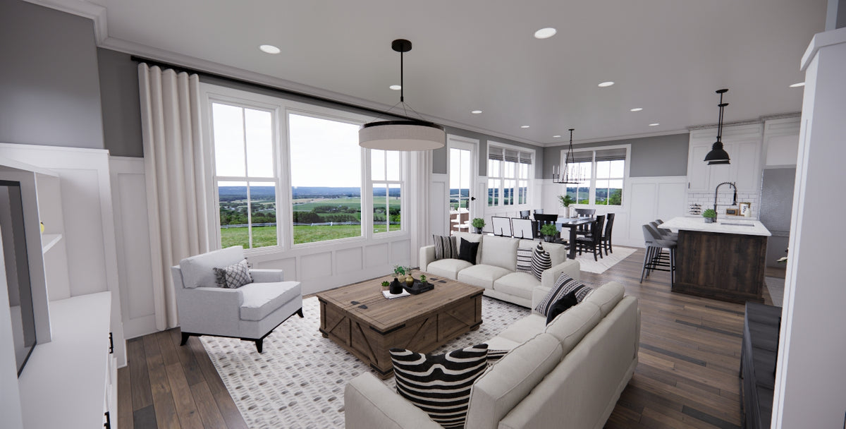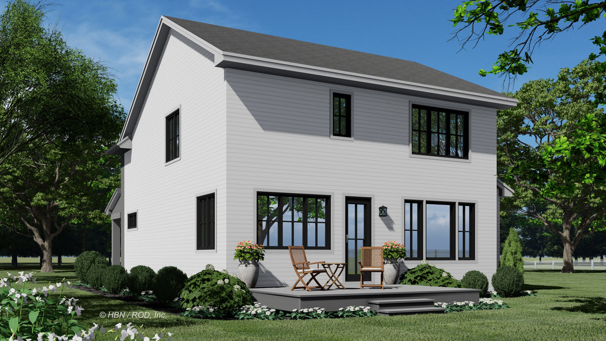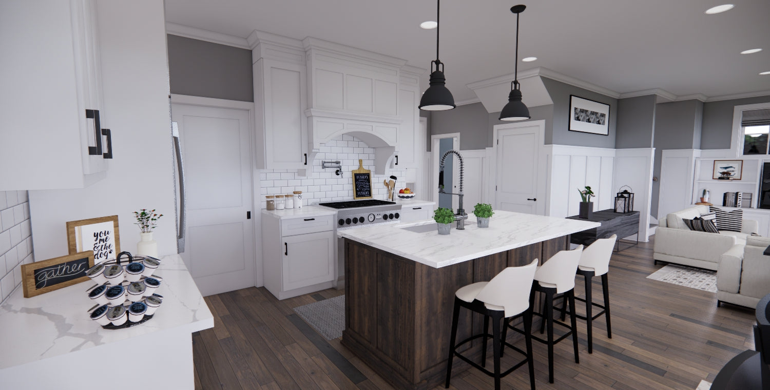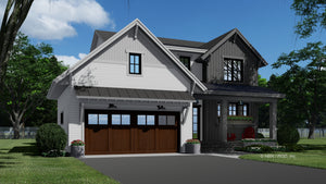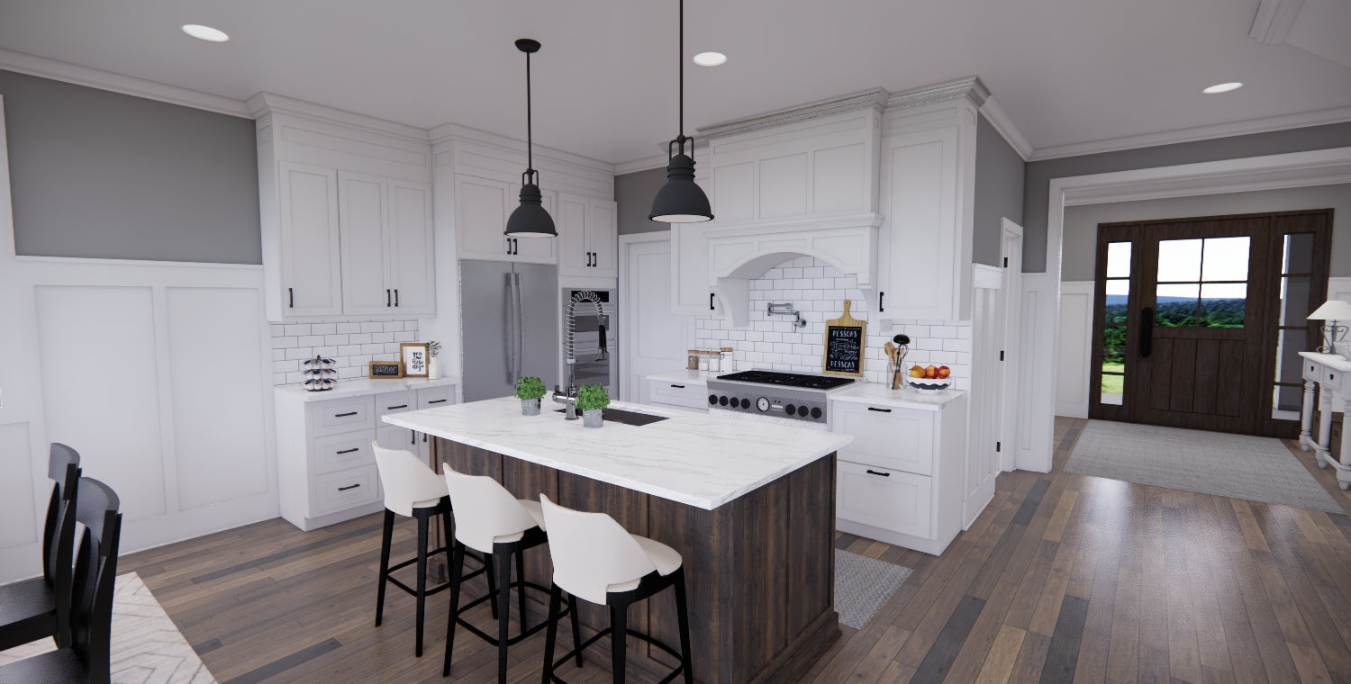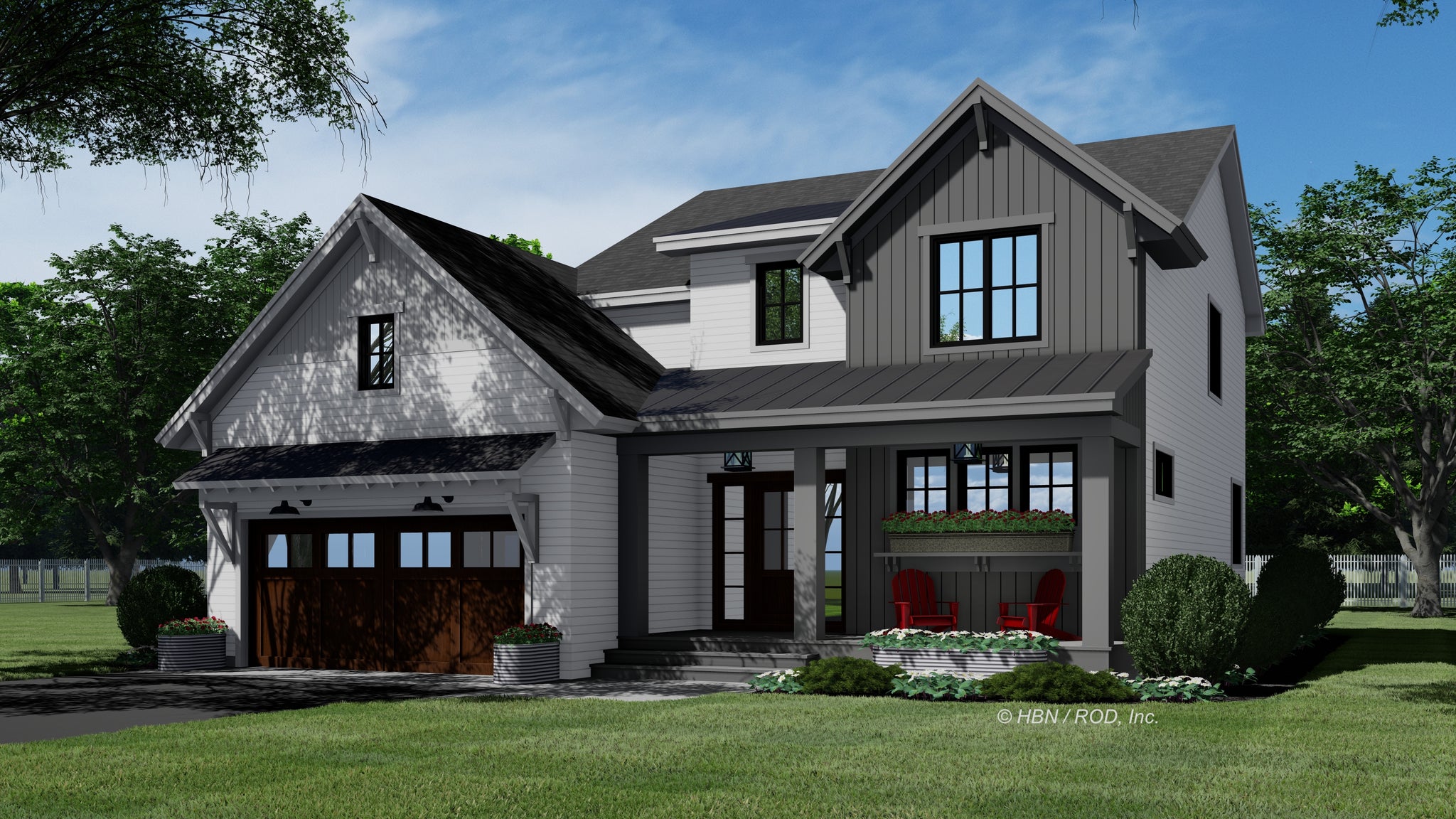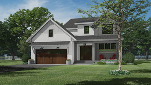 Blending classic country charm with modern functionality, this 2,265 sq ft two-story Modern Farmhouse features a gabled roof, pillared front porch, and a welcoming entry that sets the tone for the warm interior. The first floor boasts an open-concept layout with the great room, kitchen, and dining area flowing seamlessly together, filled with natural light from abundant windows. A cozy fireplace with built-ins anchors the great room, while the kitchen impresses with a large island offering seating for three, a built-in sink and dishwasher, and ample storage via multiple cabinets, a butlerβs pantry, and a walk-in pantry hidden behind a pocket door. Just off the foyer, a den with sliding barn doors creates a quiet space for work or reading, and the mudroom provides an organized drop zone from the 2-car front-load garage.