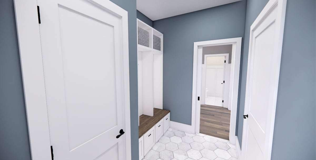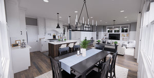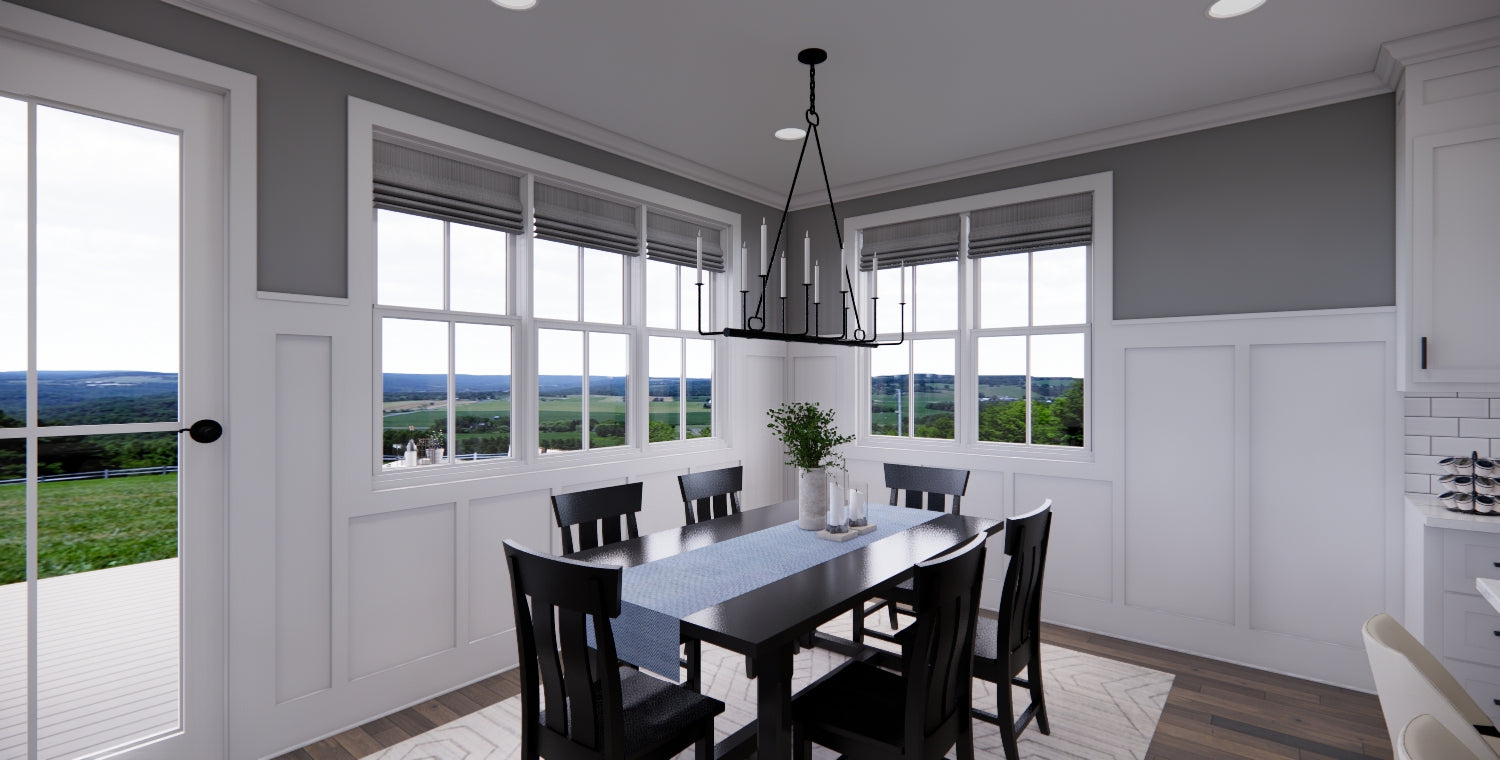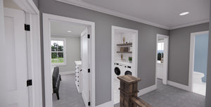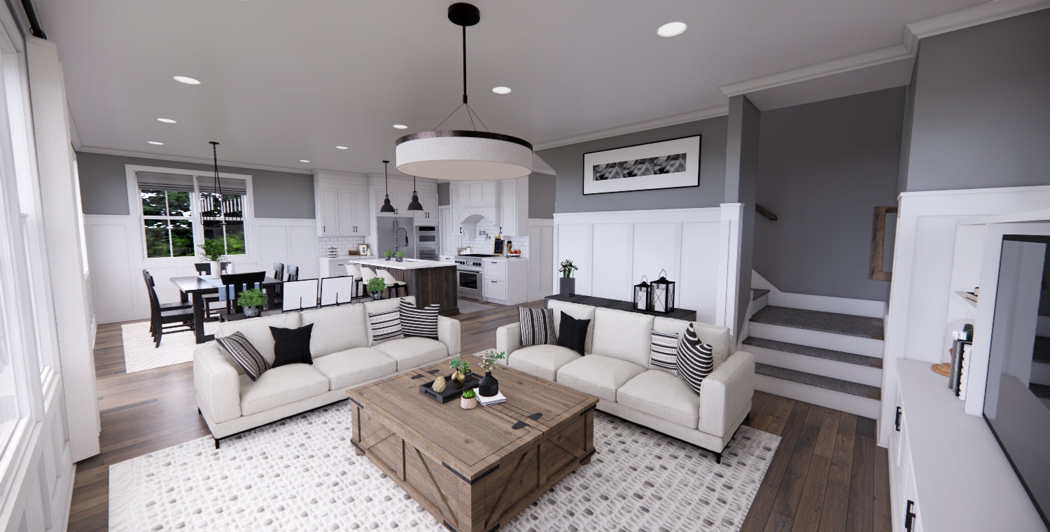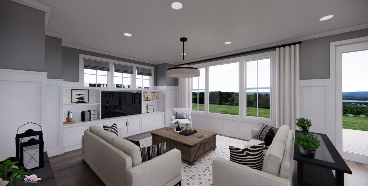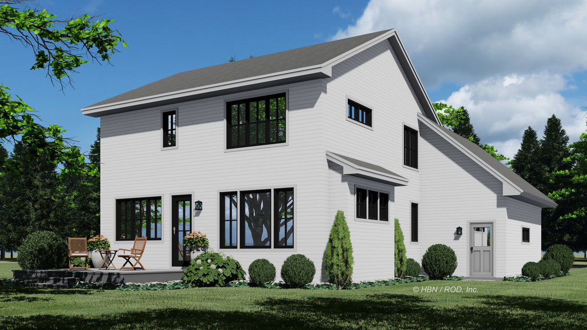 Blending classic country charm with modern functionality, this 2,265 sq ft two-story Modern Farmhouse features a gabled roof, pillared front porch, and a welcoming entry that sets the tone for the warm interior. The first floor boasts an open-concept layout with the great room, kitchen, and dining area flowing seamlessly together, filled with natural light from abundant windows. A cozy fireplace with built-ins anchors the great room, while the kitchen impresses with a large island offering seating for three, a built-in sink and dishwasher, and ample storage via multiple cabinets, a butlerβs pantry, and a walk-in pantry hidden behind a pocket door. Just off the foyer, a den with sliding barn doors creates a quiet space for work or reading, and the mudroom provides an organized drop zone from the 2-car front-load garage.