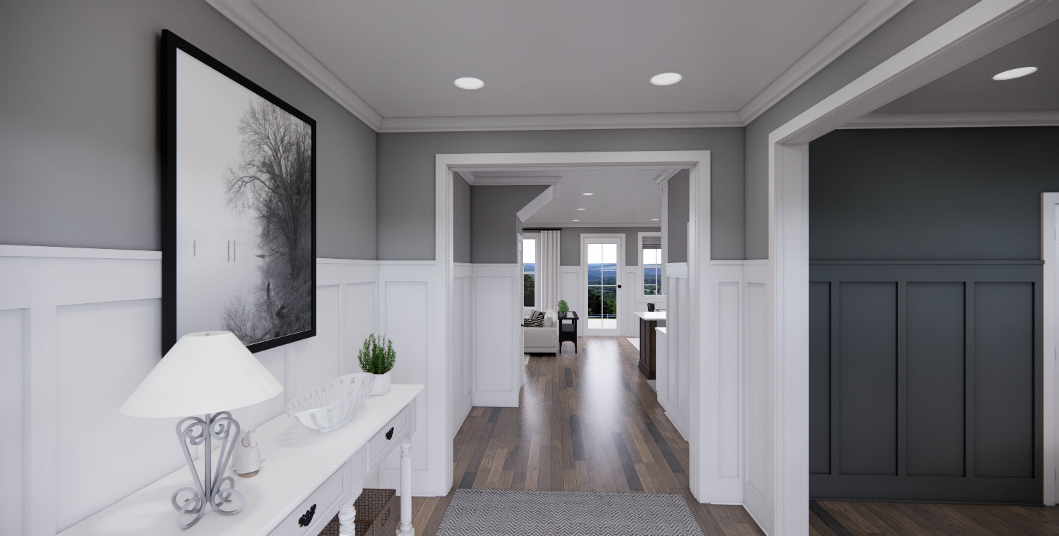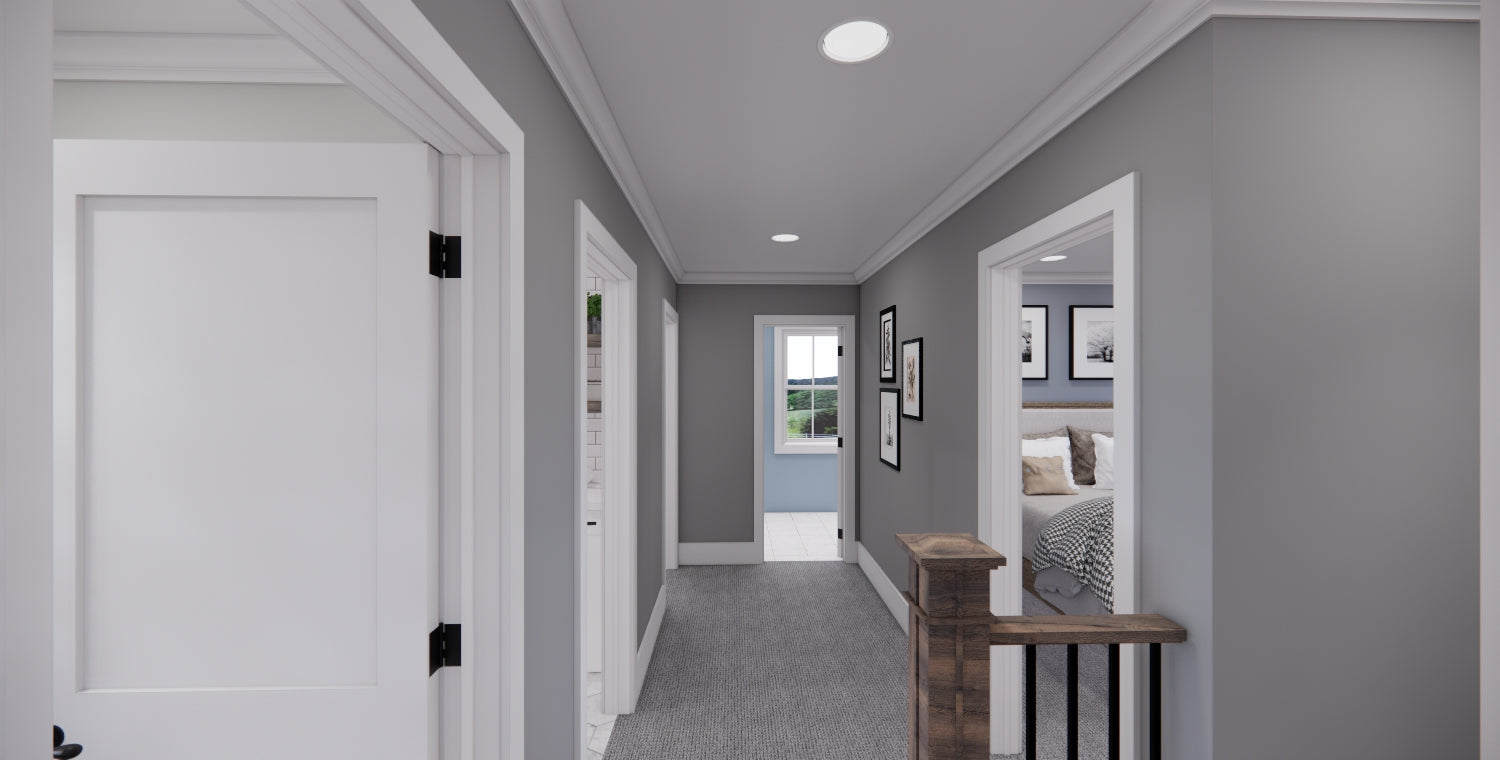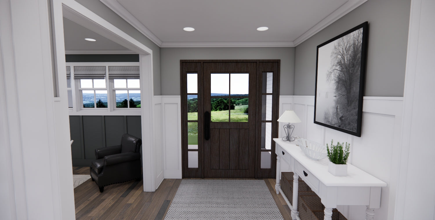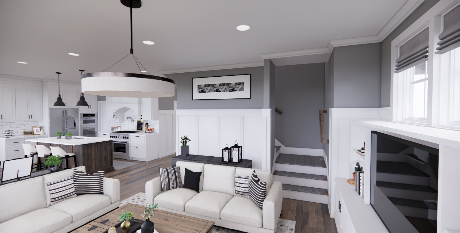 Blending classic country charm with modern functionality, this 2,265 sq ft two-story Modern Farmhouse features a gabled roof, pillared front porch, and a welcoming entry that sets the tone for the warm interior. The first floor boasts an open-concept layout with the great room, kitchen, and dining area flowing seamlessly together, filled with natural light from abundant windows. A cozy fireplace with built-ins anchors the great room, while the kitchen impresses with a large island offering seating for three, a built-in sink and dishwasher, and ample storage via multiple cabinets, a butlerβs pantry, and a walk-in pantry hidden behind a pocket door. Just off the foyer, a den with sliding barn doors creates a quiet space for work or reading, and the mudroom provides an organized drop zone from the 2-car front-load garage.