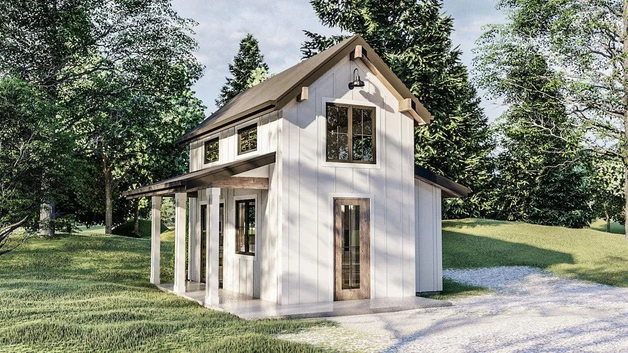 This compact house plan offers a total living area of 364 square feet, with 264 square feet on the first floor and an additional 100 square feet in a charming loft. Designed for optimal functionality, this one-bedroom, one-bathroom residence is perfect for those seeking simplicity without sacrificing comfort.