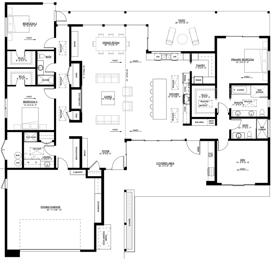 The construction drawings will include detailed, dimensioned floor plans, exterior elevations, roof plan, foundation plan, basic electrical layout, cross-section(s), foundation plan, and other general specifications. Some plans will include interior cabinet layouts.