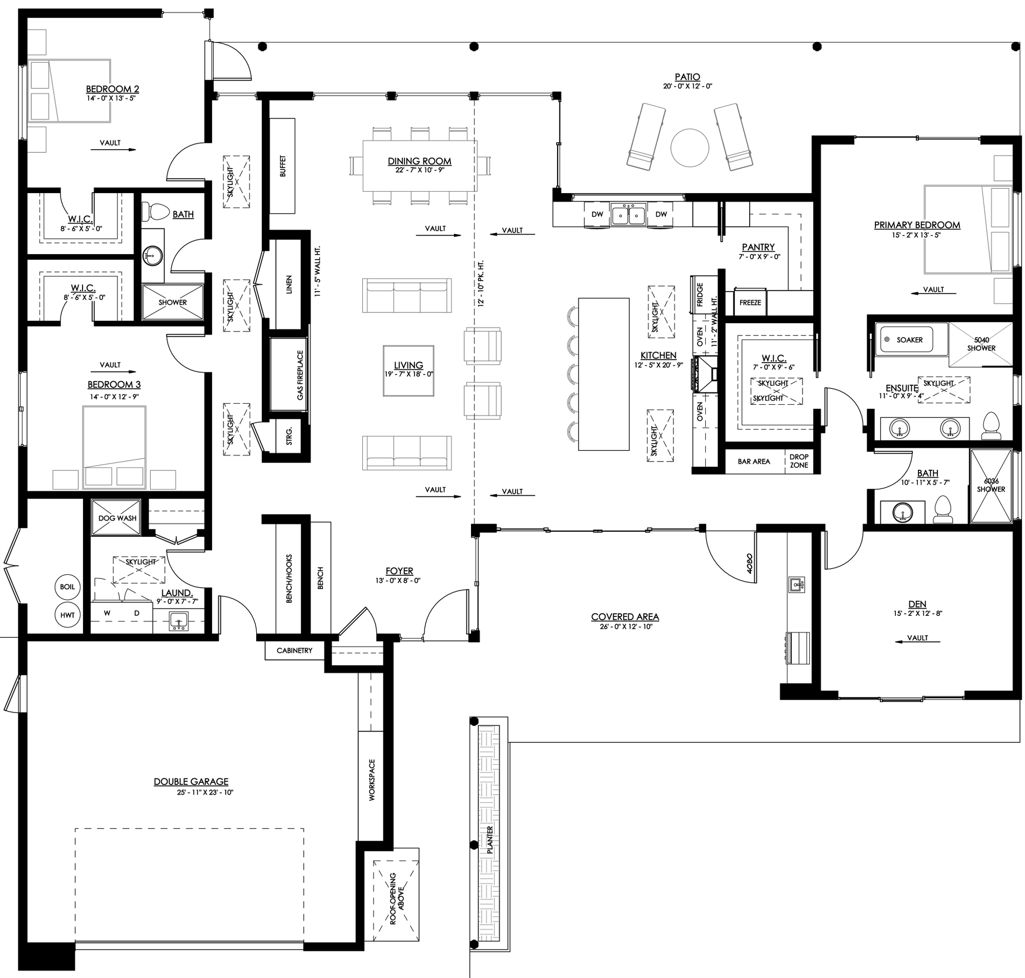 This thoughtfully designed home spans 3,118 square feet of heated living space, all situated on the first floor, with additional outdoor areas like a 472-square-foot deck and 546-square-foot porch. The 2-car garage offers 700 square feet of space with a front-facing entry. The home features a slab foundation, 2x6 wall framing, and stick roof framing with a 1:12 pitch. The building measures 78'-9'' in width and 75'-6'' in depth, with a height of 15'-3''. Inside, the first-floor ceiling reaches 9 feet, with vaulted ceilings enhancing the open floor plan.
