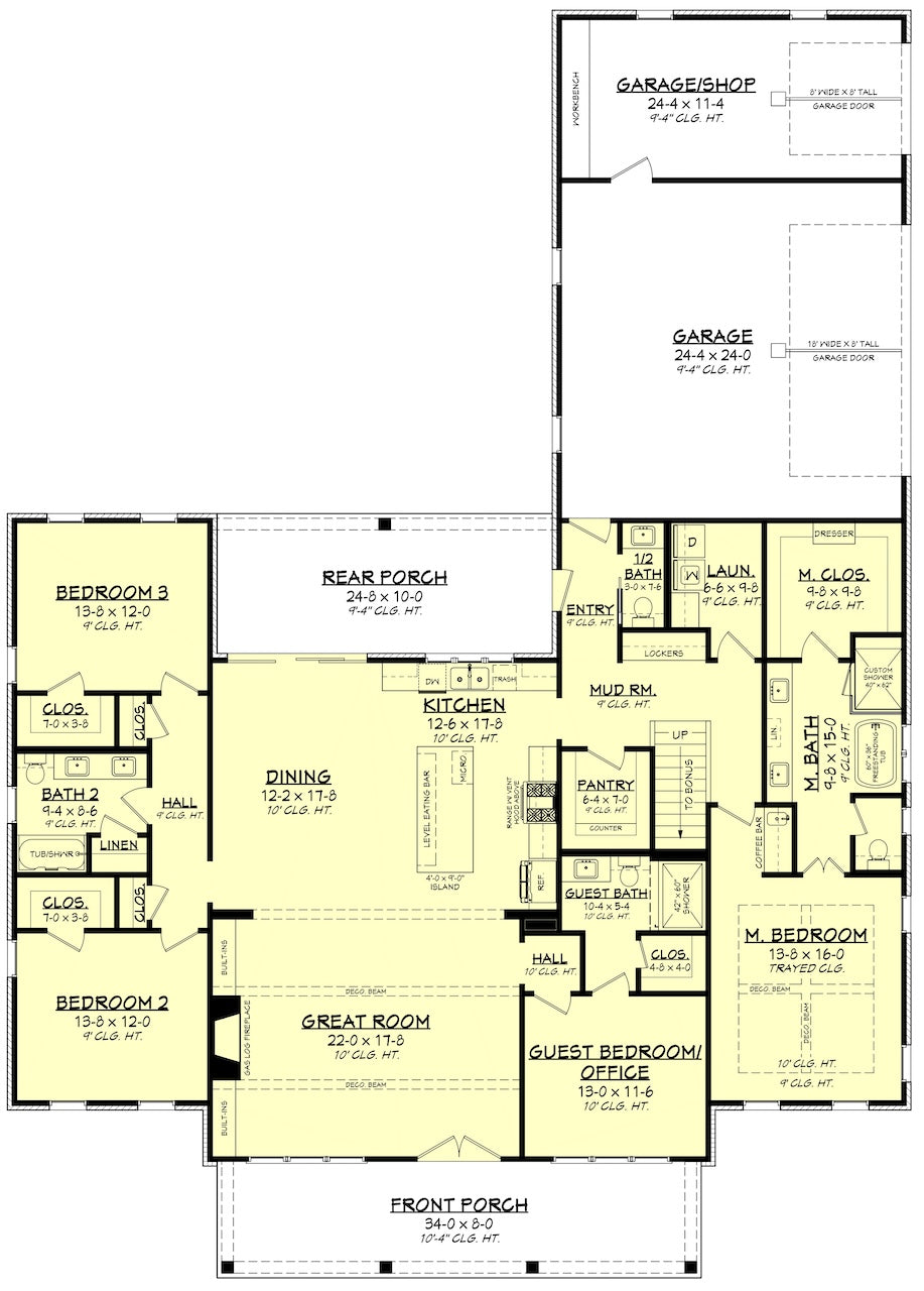 This beautiful 4-bedroom, 3.5-bath home plan offers a generous 2,585 sq. ft. of living space, thoughtfully designed for comfort and convenience. The open layout features a large great room that flows into a well-equipped kitchen with a spacious island and walk-in pantry, perfect for both family living and entertaining. The first-floor master suite offers a private retreat, complete with a walk-in closet and easy access to the laundry room and mudroom. A guest suite on the main floor provides privacy and comfort for visitors, while the split bedroom design ensures peaceful living for the whole family.