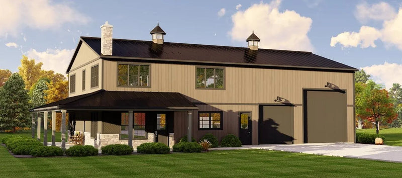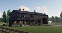 Board and batten siding mimics the ribbed metal roof on the exterior of this deluxe Barndominium-style house plan (stick-framing) with a porch that wraps around the front-left corner and goes all the way down the left side.The right side of this design is where you'll find the 1,480 square foot garage, complete with a powder bath, a 10' by 10' and a large RV-friendly 14' by 14' overhead garage doors.The living room has a fireplace tucked in the corner and a 2-story ceiling and is open to the eat-in kitchen; a dream layout for entertaining.The master bedroom is located on the main level and features a tile shower in the attached bathroom, along with a shortcut to the laundry room. Upstairs, discover a sizable loft, as well as bedrooms 2 and 3 that share a full bath.The exterior finish is spec'd for 24" Vertical board and batten cement board siding.