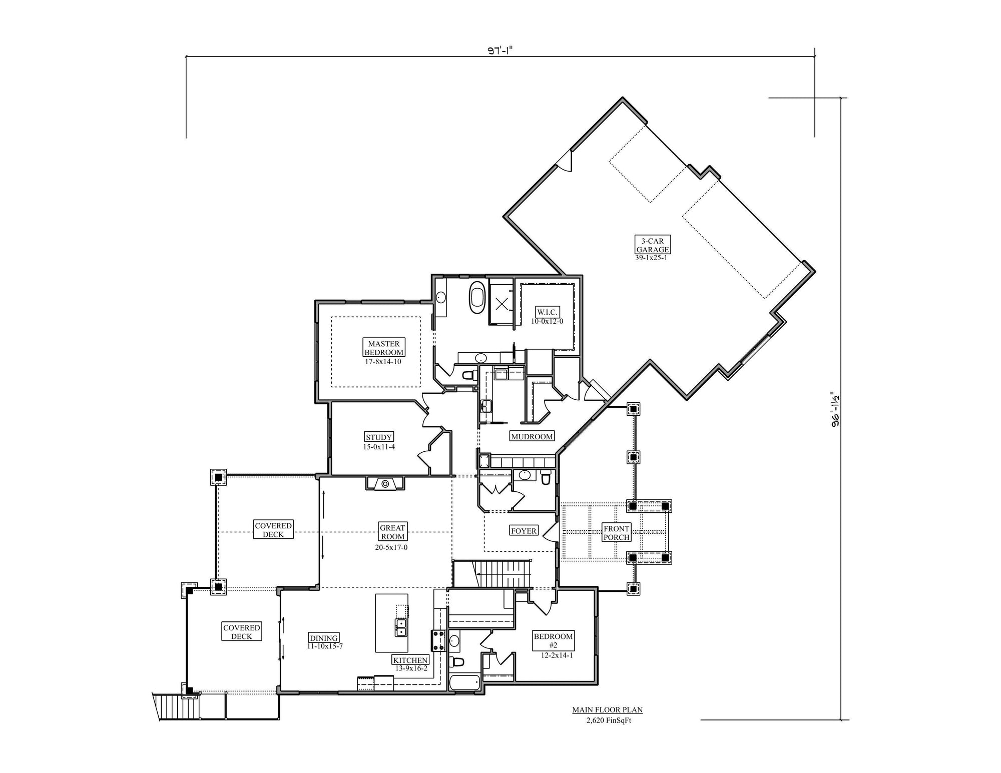 This stunning house plan features a total living area of 2,620 square feet, all situated on the first floor. The layout includes two spacious bedrooms, two full bathrooms, and one half bathroom, making it perfect for comfortable living. With a generous basement area of 2,279 square feet and an expansive deck measuring 909 square feet, this design emphasizes outdoor living and recreation.