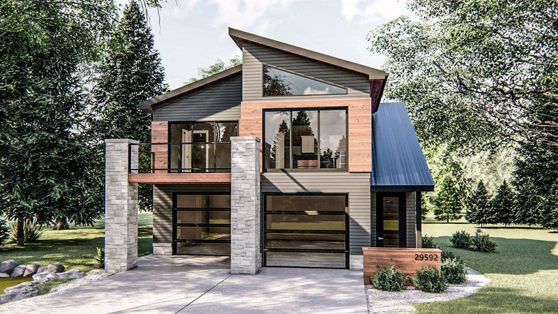 Modern styling, metal roof, thinsetstone veneer, and cedar siding help set this 2 carapartment garageapart from its competition. When pulling into your 2 car garage you will be greeted with 9' wide glass garage doors and ample room for your daily driver. A formal entry with staircase sits behind the cedar planter box which leads you upstairs to your 1 bedroom apartment. A kitchen with all the amenities which are found in a much larger home sits at the top of the stairs. The kitchen hosts an island for entertaining guest as well as a walk-up pantry. Tall sloped ceilings andgreat views to both the diningand family room from the kitchen are whatto expect in this unique modern apartment garage. The master bedroom lies just off of the kitchen and it hosts its own walk-in closet,3/4 bath and a walkout deck that sits above the 2 car garage.