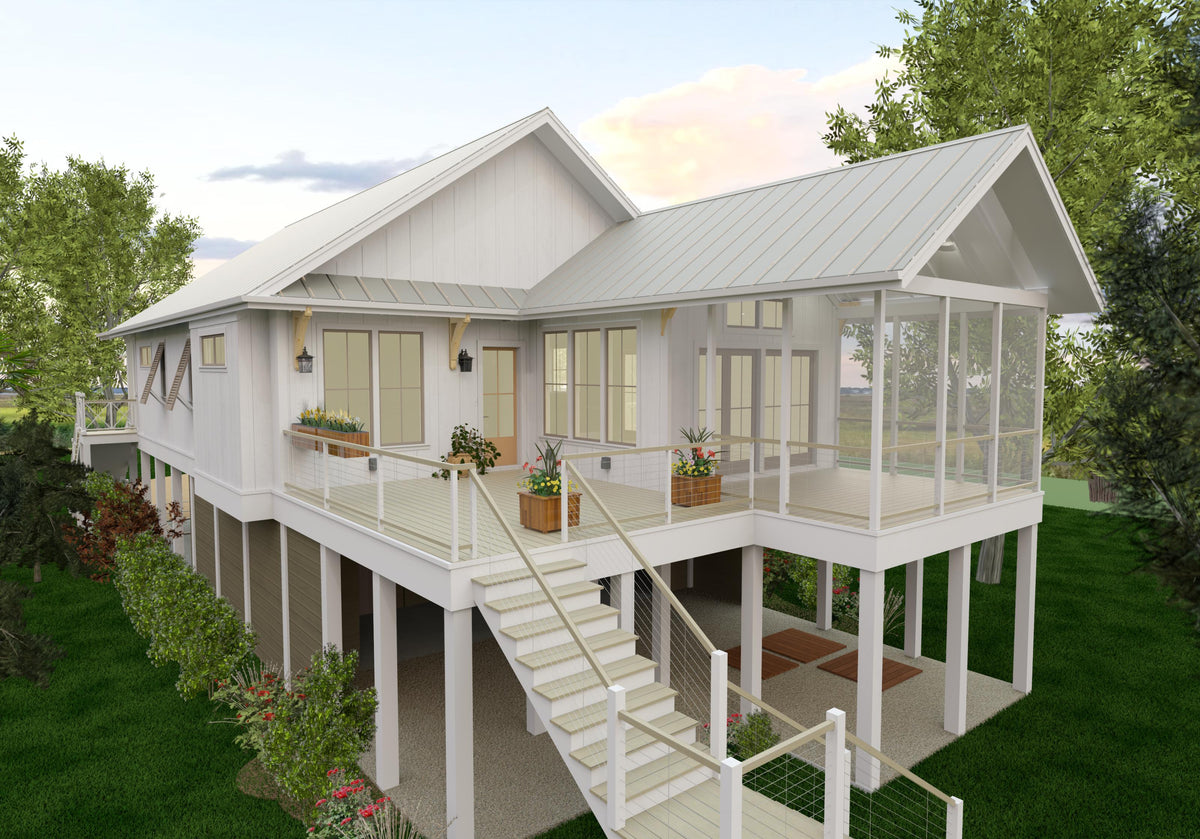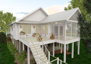 This beautiful 1,547 sq ft coastal home offers an ideal blend of style, comfort, and practicality. Built on pilings with 2x6 wall framing, the design features a traditional roof pitch of 8:12, ensuring both durability and aesthetic appeal. The first floor, spanning 1,547 sq ft, includes three bedrooms and two bathrooms, with a spacious family/keeping room that serves as the perfect place for gathering and relaxation. The master suite is well-appointed with walk-in closets, providing ample storage space and a retreat-like feel.