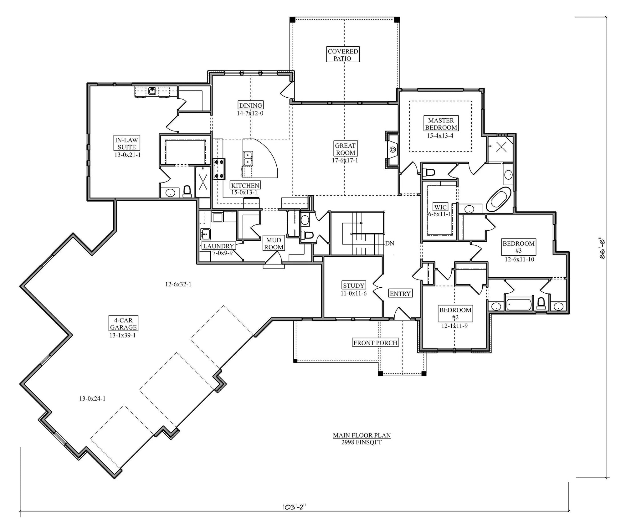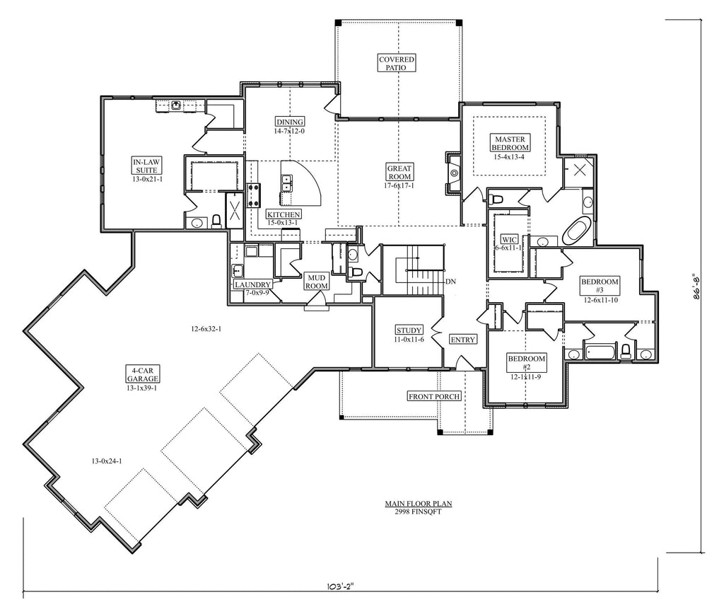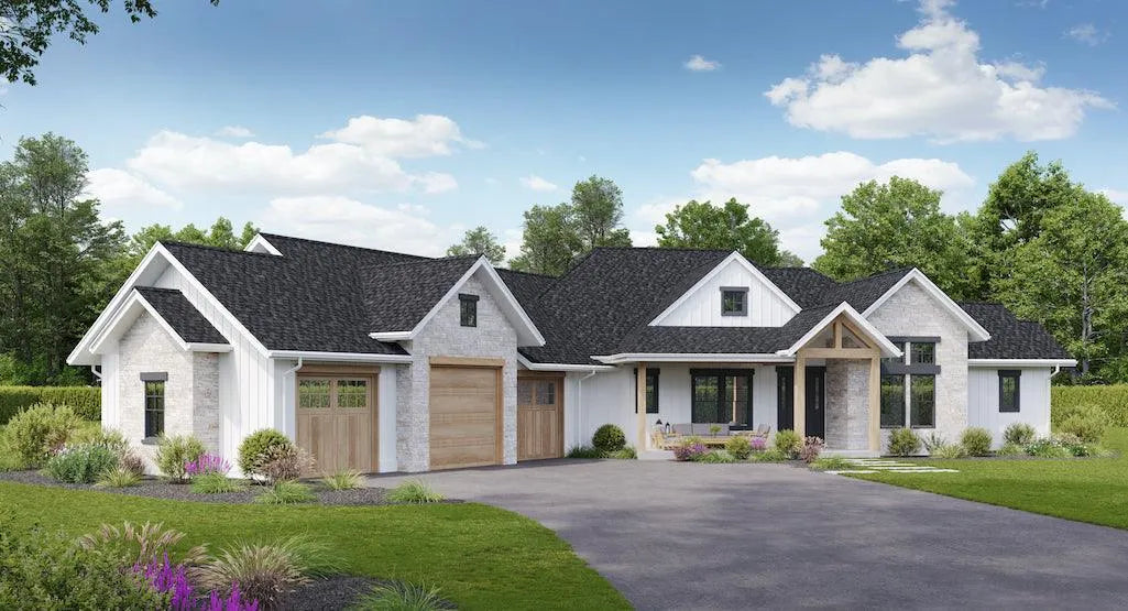 A highlight of this home is the substantial 1,599 sq ft garage, which accommodates four vehicles and offers convenient courtyard access. The design includes a spacious deck of 546 sq ft, perfect for outdoor entertaining and relaxation. Built on a sturdy walkout basement foundation and framed with durable 2x6 walls, this home stands at a height of 25 feet 2 inches, with a first-floor ceiling height of 10 feet. Its dimensions of 103 feet 2 inches in width and 86 feet 8 inches in depth provide a commanding presence in any neighborhood.