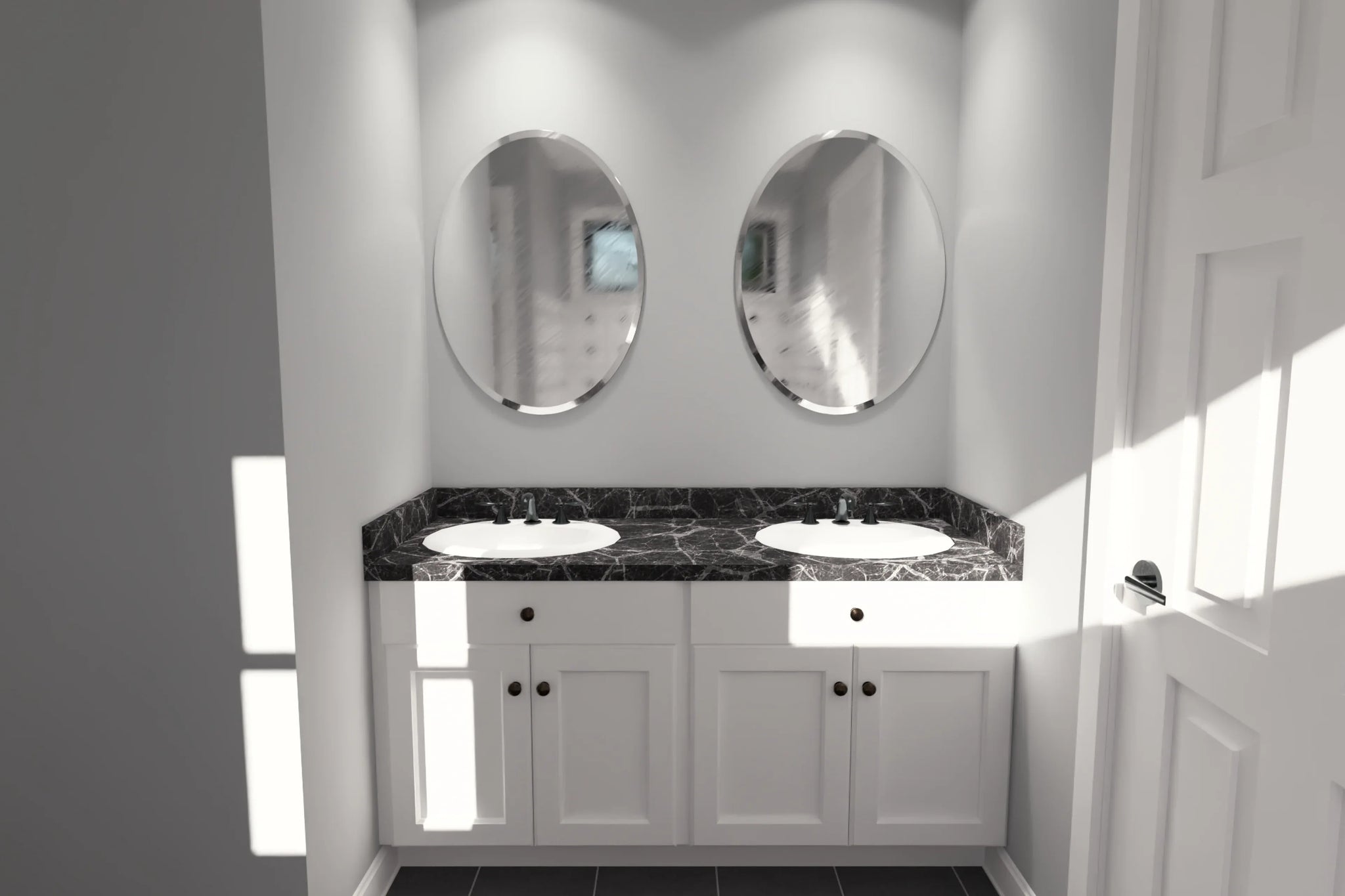 One of the standout features of this plan is its first-floor primary suite, thoughtfully positioned for privacy and convenience. The bedroom offers comfortable proportions, while the private master bath features a double vanity—a luxury feature that enhances everyday comfort. A generous walk-in closet completes the suite, providing ample storage for clothing and personal items.