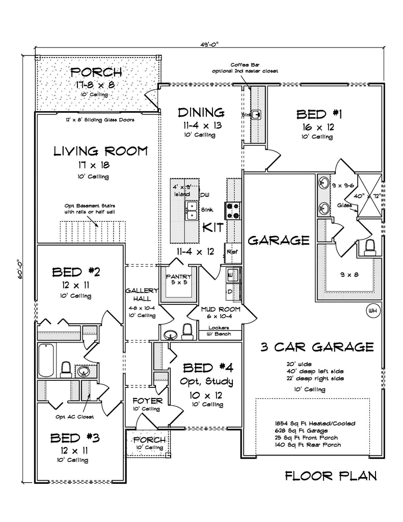 The plan includes a 3-car front-load garage with 628 sq ft of space, offering room for vehicles, storage, and hobbies. Additional storage is found throughout the home in walk-in closets, pantry spaces, and mudroom areas, ensuring everything has its place while keeping the interior organized and clutter-free.