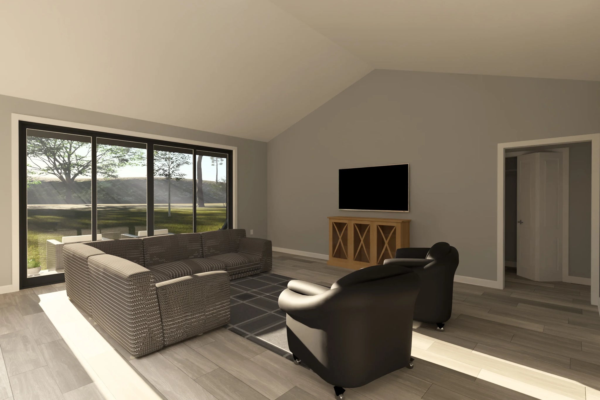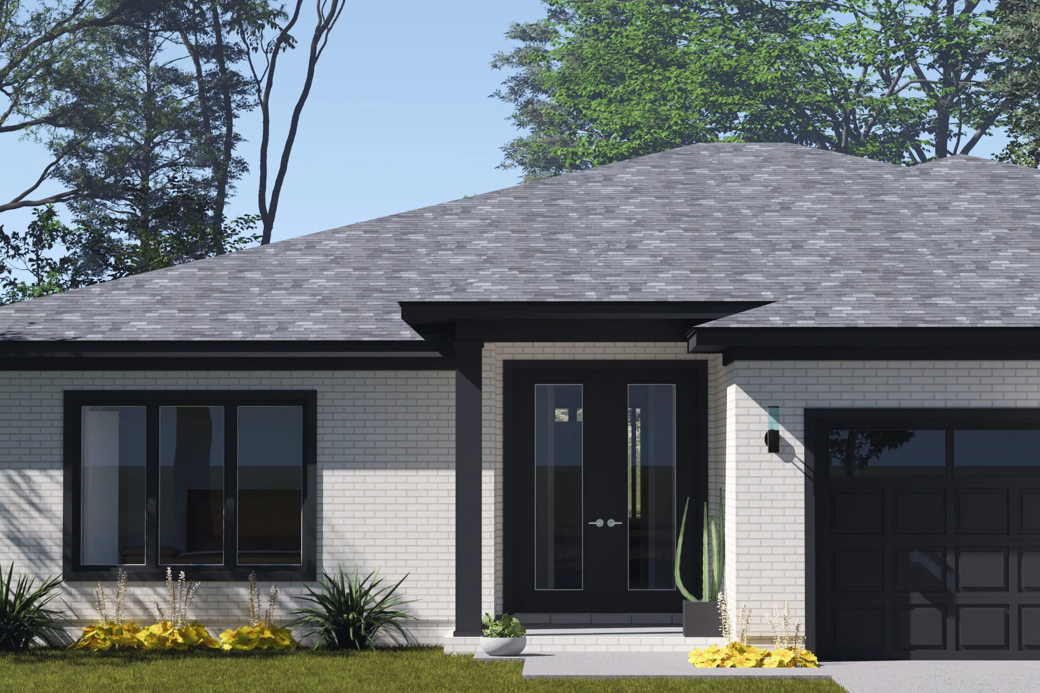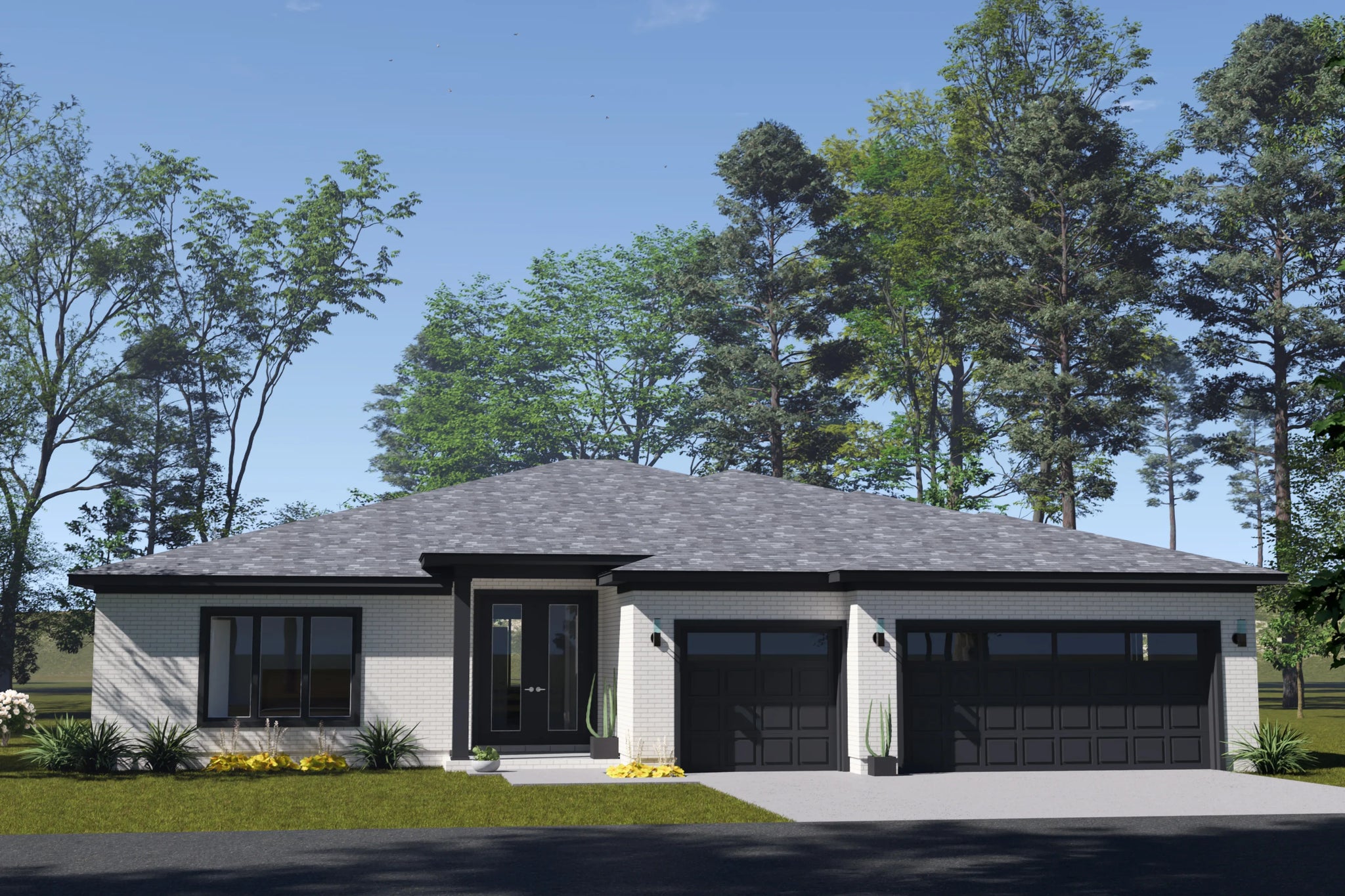 The exterior presents a clean, confident presence with contemporary proportions and a low-profile 4:12 roof pitch that enhances the home’s modern character. A welcoming covered front porch creates a warm point of entry, offering a space to greet guests or enjoy a quiet moment outdoors. Measuring 56 feet wide by 63 feet deep, the home offers strong curb appeal while remaining adaptable to a variety of lot types, from suburban neighborhoods to semi-rural settings.
