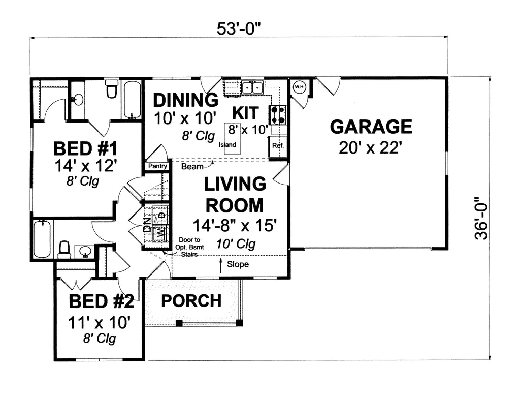 With a roof pitch of 8:12, the exterior showcases classic architectural appeal. The house measures 53' in width and 36' in depth, with a building height of 18'. Inside, the first-floor ceiling height is a comfortable 8', enhancing the open feel of the space.