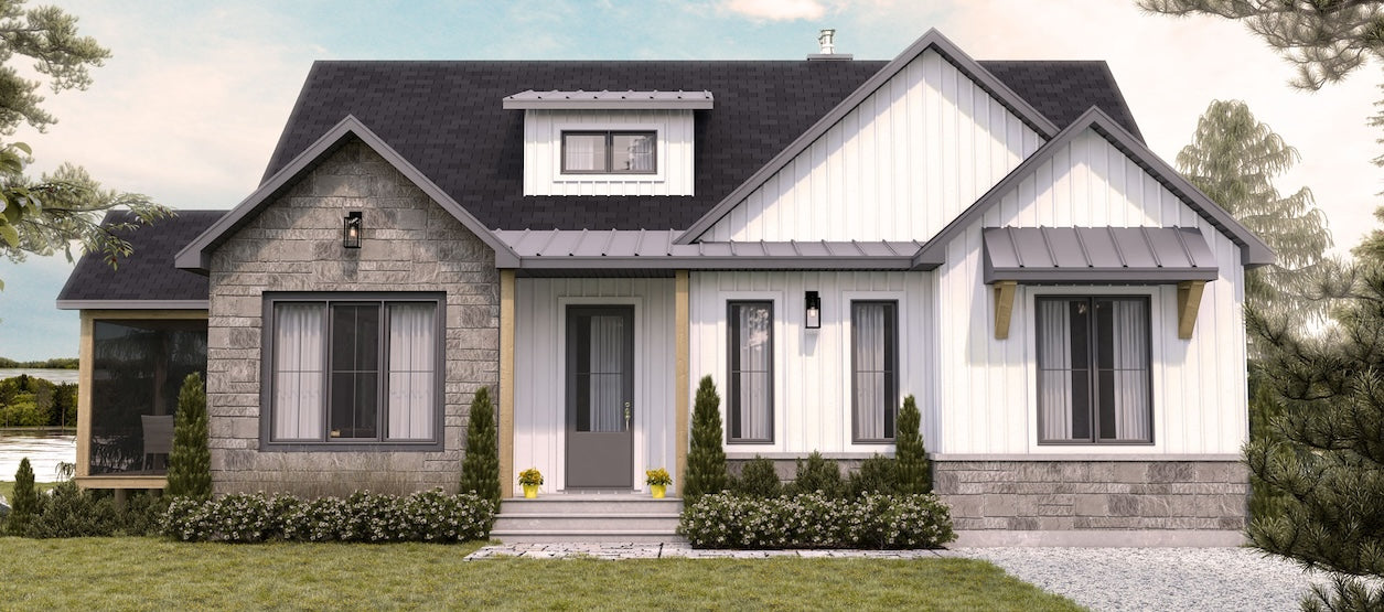 • This Transitional Ranch plan offers all of the amenities for families of any size with stone, board and batten, and metal roof accents giving the exterior a modern appeal to the otherwise traditional design.