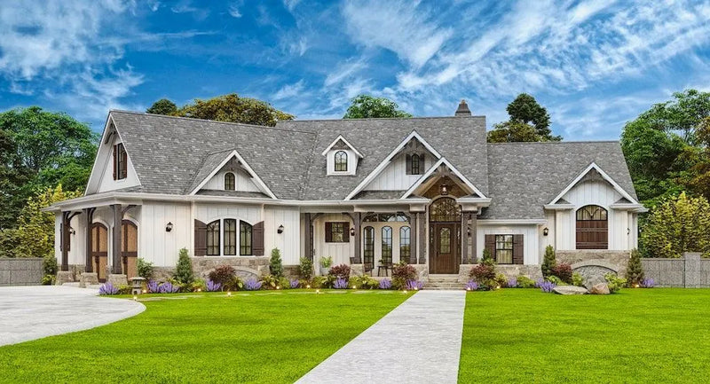 The Nantahala Cottage house plan is a charming and spacious home with a distinct cottage-style architecture. It features a visually appealing exterior with a combination of natural materials and architectural elements that exude a cozy and rustic charm. The exterior may include features such as stone accents, exposed beams, dormer windows, and a mix of siding materials like wood, brick, or stone. The house plan is designed with functionality and comfort in mind, offering a well-organized layout that maximizes usable space. The main entry welcomes residents and guests into the home featuring an inviting porch and foyer. It also includes spacious lodge room. The kitchen includes an island and breakfast bar, and easy access to the dining area. The plan also includes other desirable features, such as a garage for parking and storage, a laundry room and mudroom.