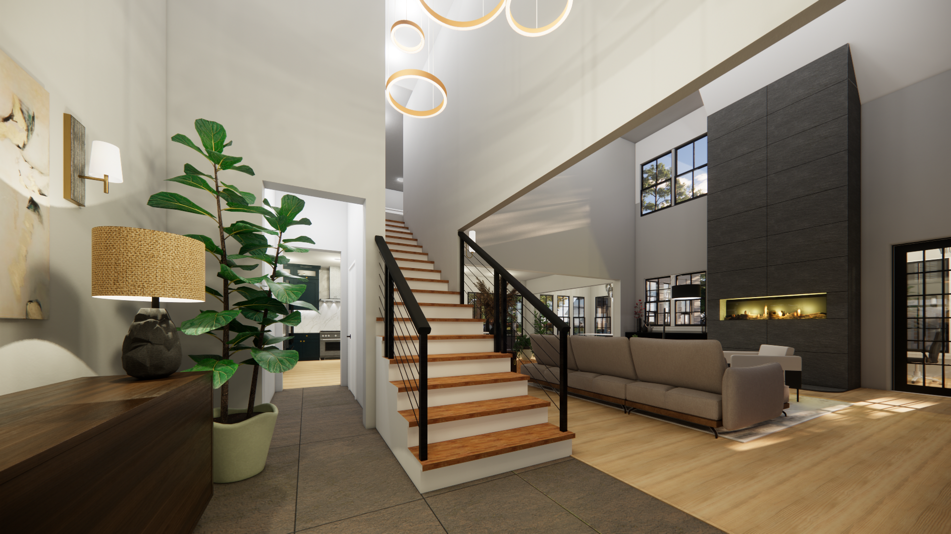 From the exterior, the home makes a confident yet welcoming statement. A steep 16:12 roof pitch introduces dramatic verticality and reinforces the New American aesthetic, while the covered front porch softens the façade and creates a gracious point of arrival. The side-load garage preserves curb appeal and allows the architecture—not the vehicles—to take center stage. Proportions are balanced and substantial, designed to feel enduring rather than trendy.