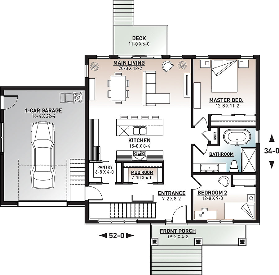 Key features of this home include a first-floor master suite, a mudroom, and a walk-in pantry, making it ideal for comfort and convenience in a compact, functional space.