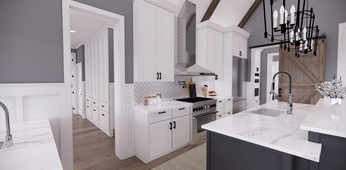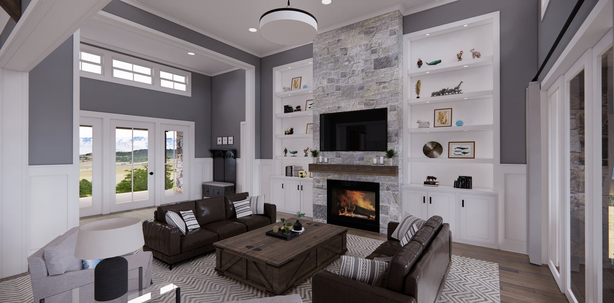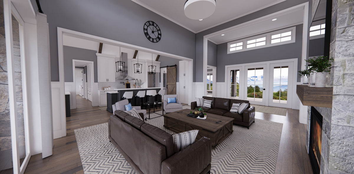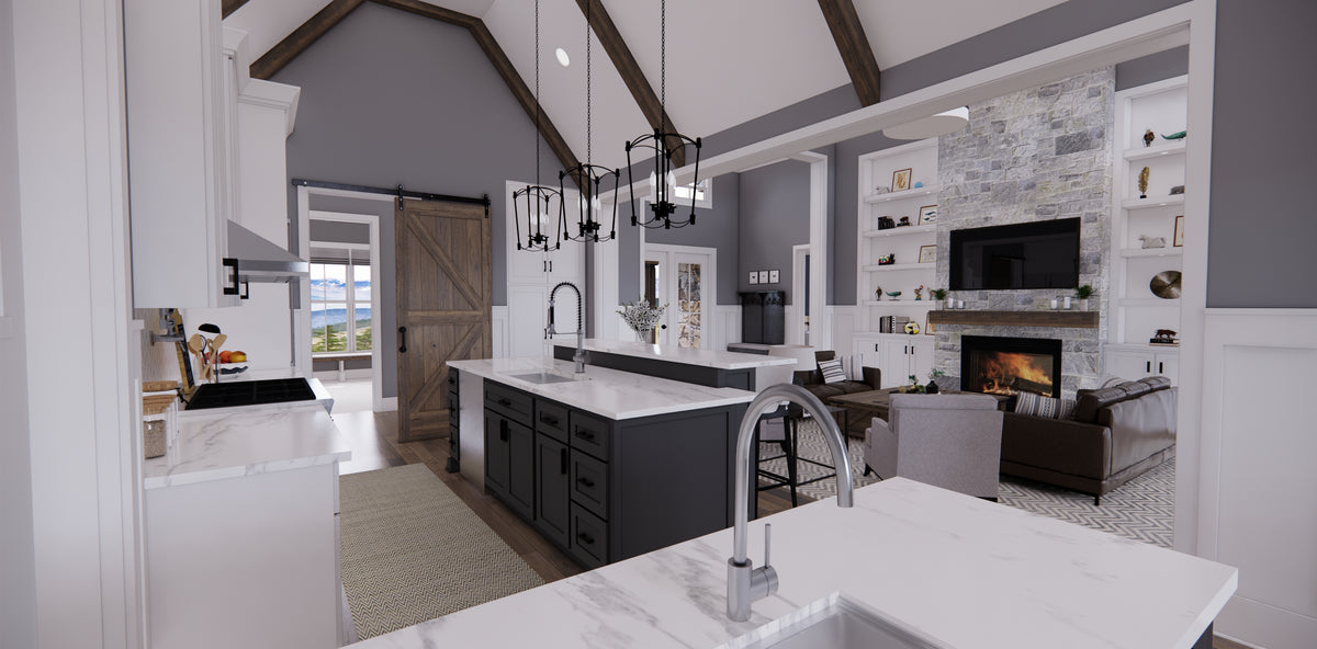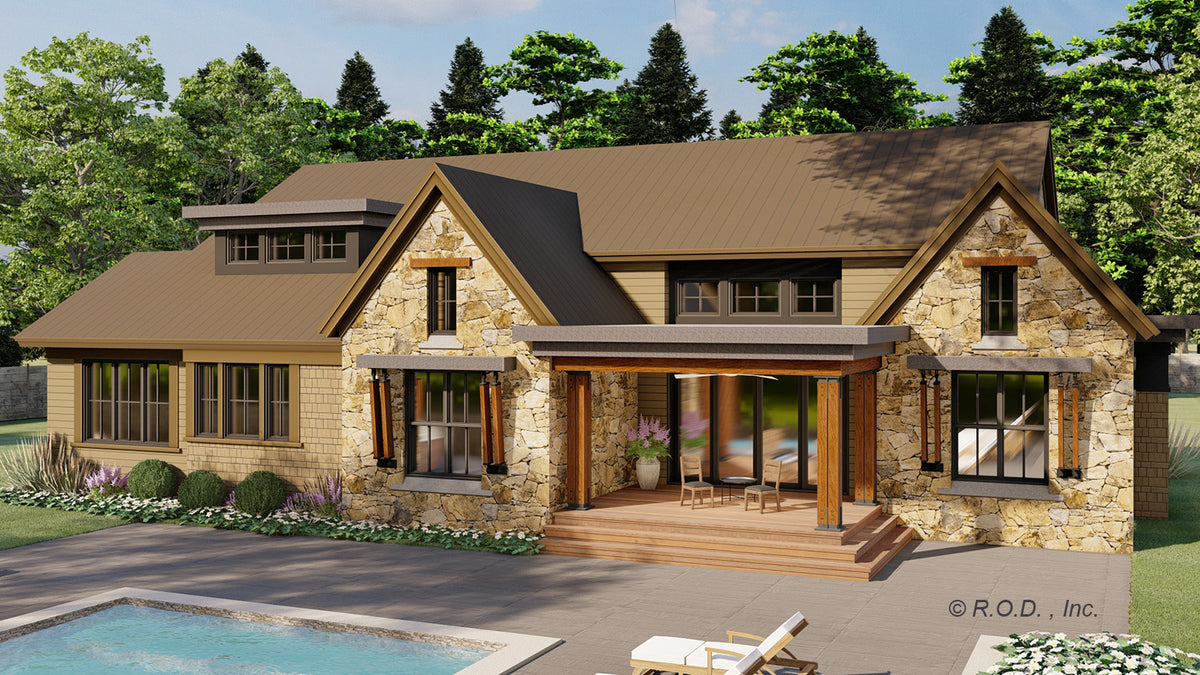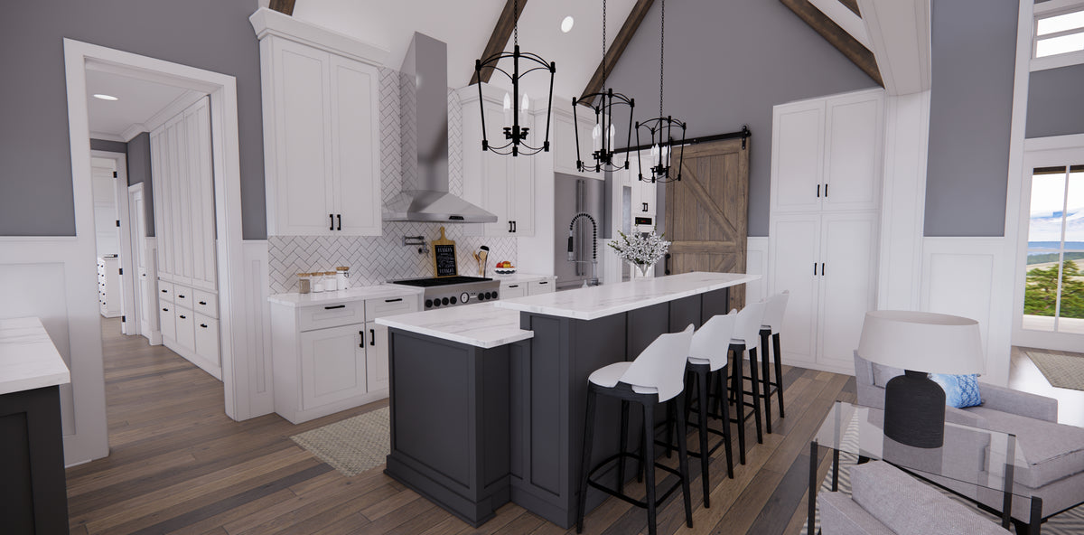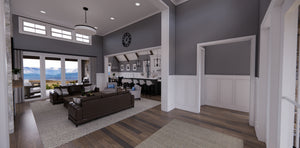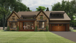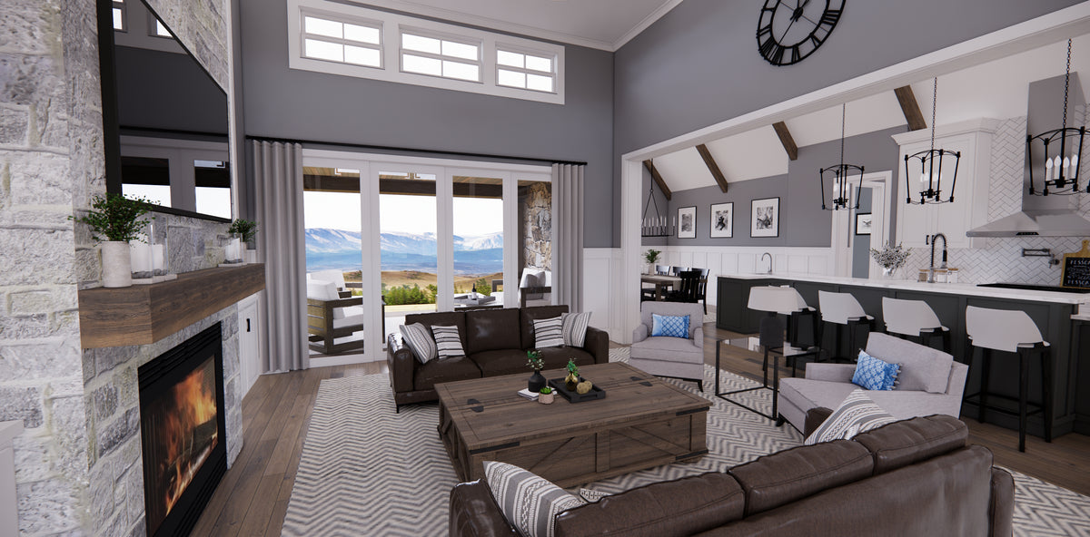 With striking wood and stone accents, this 2,358 sq ft Craftsman home delivers timeless beauty and family-friendly function all in one. Inside, a wide-open layout connects the great room, kitchen, and dining room beneath vaulted ceilings, creating an ideal space for gathering and entertaining. The great room features a cozy fireplace with built-ins and a 12’ folding door opening to the expansive covered rear porch. The kitchen includes a large island with seating for four, a walk-in pantry with sliding barn doors, and a convenient wet bar—perfect for everything from morning coffee to evening cocktails.